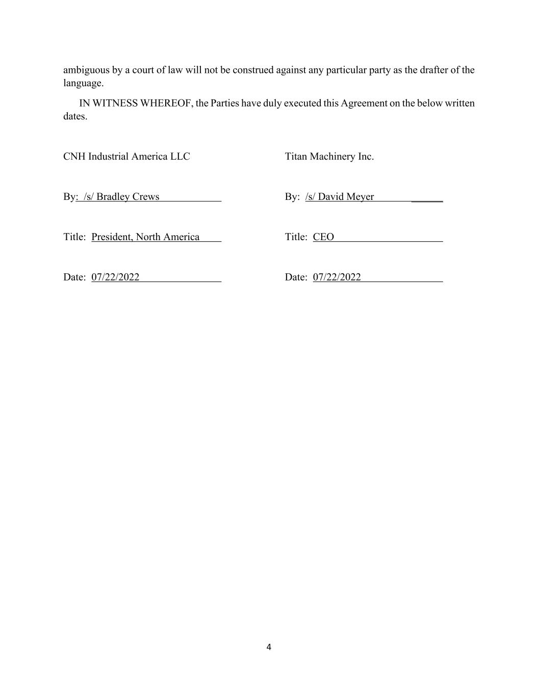 4    ambiguous by a court of law will not be construed against any particular party as the drafter of the language. IN WITNESS WHEREOF, the Parties have duly executed this Agreement on the below written dates. CNH Industrial America LLC Titan Machinery Inc. By: /s/ Bradley Crews By: /s/ David Meyer ______ Title: President, North America Title: CEO Date: 07/22/2022 Date: 07/22/2022