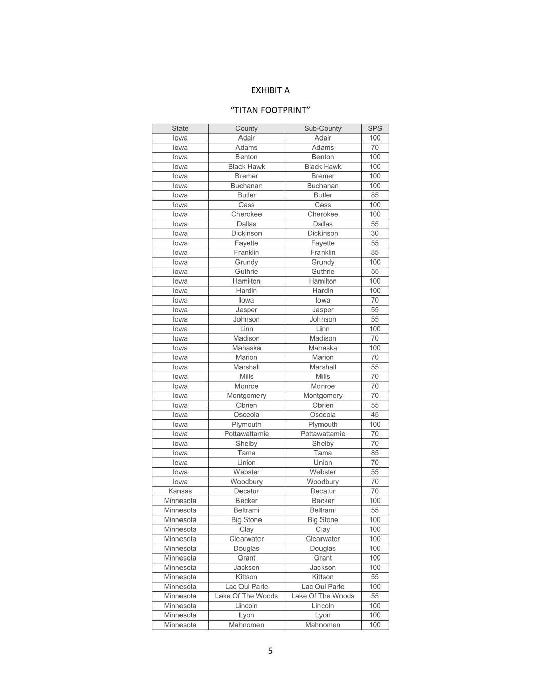 5    EXHIBIT A  “TITAN FOOTPRINT”  State County Sub-County SPS Iowa Adair Adair 100 Iowa Adams Adams 70 Iowa Benton Benton 100 Iowa Black Hawk Black Hawk 100 Iowa Bremer Bremer 100 Iowa Buchanan Buchanan 100 Iowa Butler Butler 85 Iowa Cass Cass 100 Iowa Cherokee Cherokee 100 Iowa Dallas Dallas 55 Iowa Dickinson Dickinson 30 Iowa Fayette Fayette 55 Iowa Franklin Franklin 85 Iowa Grundy Grundy 100 Iowa Guthrie Guthrie 55 Iowa Hamilton Hamilton 100 Iowa Hardin Hardin 100 Iowa Iowa Iowa 70 Iowa Jasper Jasper 55 Iowa Johnson Johnson 55 Iowa Linn Linn 100 Iowa Madison Madison 70 Iowa Mahaska Mahaska 100 Iowa Marion Marion 70 Iowa Marshall Marshall 55 Iowa Mills Mills 70 Iowa Monroe Monroe 70 Iowa Montgomery Montgomery 70 Iowa Obrien Obrien 55 Iowa Osceola Osceola 45 Iowa Plymouth Plymouth 100 Iowa Pottawattamie Pottawattamie 70 Iowa Shelby Shelby 70 Iowa Tama Tama 85 Iowa Union Union 70 Iowa Webster Webster 55 Iowa Woodbury Woodbury 70 Kansas Decatur Decatur 70 Minnesota Becker Becker 100 Minnesota Beltrami Beltrami 55 Minnesota Big Stone Big Stone 100 Minnesota Clay Clay 100 Minnesota Clearwater Clearwater 100 Minnesota Douglas Douglas 100 Minnesota Grant Grant 100 Minnesota Jackson Jackson 100 Minnesota Kittson Kittson 55 Minnesota Lac Qui Parle Lac Qui Parle 100 Minnesota Lake Of The Woods Lake Of The Woods 55 Minnesota Lincoln Lincoln 100 Minnesota Lyon Lyon 100 Minnesota Mahnomen Mahnomen 100