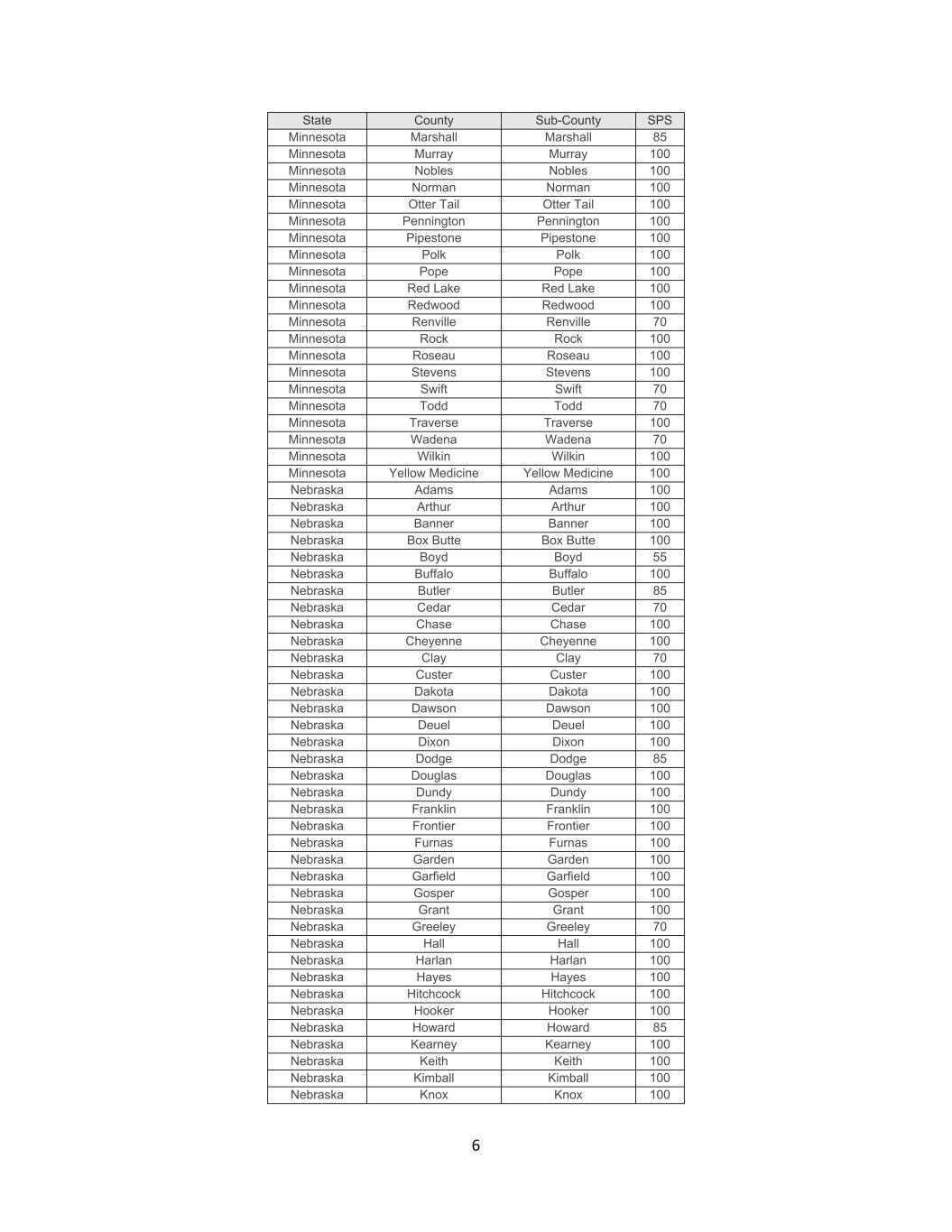6    State County Sub-County SPS Minnesota Marshall Marshall 85 Minnesota Murray Murray 100 Minnesota Nobles Nobles 100 Minnesota Norman Norman 100 Minnesota Otter Tail Otter Tail 100 Minnesota Pennington Pennington 100 Minnesota Pipestone Pipestone 100 Minnesota Polk Polk 100 Minnesota Pope Pope 100 Minnesota Red Lake Red Lake 100 Minnesota Redwood Redwood 100 Minnesota Renville Renville 70 Minnesota Rock Rock 100 Minnesota Roseau Roseau 100 Minnesota Stevens Stevens 100 Minnesota Swift Swift 70 Minnesota Todd Todd 70 Minnesota Traverse Traverse 100 Minnesota Wadena Wadena 70 Minnesota Wilkin Wilkin 100 Minnesota Yellow Medicine Yellow Medicine 100 Nebraska Adams Adams 100 Nebraska Arthur Arthur 100 Nebraska Banner Banner 100 Nebraska Box Butte Box Butte 100 Nebraska Boyd Boyd 55 Nebraska Buffalo Buffalo 100 Nebraska Butler Butler 85 Nebraska Cedar Cedar 70 Nebraska Chase Chase 100 Nebraska Cheyenne Cheyenne 100 Nebraska Clay Clay 70 Nebraska Custer Custer 100 Nebraska Dakota Dakota 100 Nebraska Dawson Dawson 100 Nebraska Deuel Deuel 100 Nebraska Dixon Dixon 100 Nebraska Dodge Dodge 85 Nebraska Douglas Douglas 100 Nebraska Dundy Dundy 100 Nebraska Franklin Franklin 100 Nebraska Frontier Frontier 100 Nebraska Furnas Furnas 100 Nebraska Garden Garden 100 Nebraska Garfield Garfield 100 Nebraska Gosper Gosper 100 Nebraska Grant Grant 100 Nebraska Greeley Greeley 70 Nebraska Hall Hall 100 Nebraska Harlan Harlan 100 Nebraska Hayes Hayes 100 Nebraska Hitchcock Hitchcock 100 Nebraska Hooker Hooker 100 Nebraska Howard Howard 85 Nebraska Kearney Kearney 100 Nebraska Keith Keith 100 Nebraska Kimball Kimball 100 Nebraska Knox Knox 100
