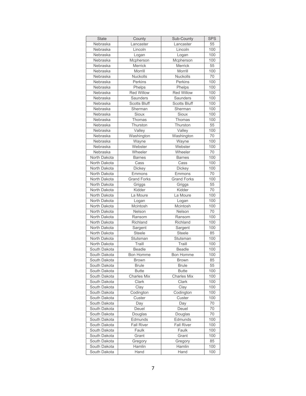 7    State County Sub-County SPS Nebraska Lancaster Lancaster 55 Nebraska Lincoln Lincoln 100 Nebraska Logan Logan 100 Nebraska Mcpherson Mcpherson 100 Nebraska Merrick Merrick 55 Nebraska Morrill Morrill 100 Nebraska Nuckolls Nuckolls 70 Nebraska Perkins Perkins 100 Nebraska Phelps Phelps 100 Nebraska Red Willow Red Willow 100 Nebraska Saunders Saunders 100 Nebraska Scotts Bluff Scotts Bluff 100 Nebraska Sherman Sherman 100 Nebraska Sioux Sioux 100 Nebraska Thomas Thomas 100 Nebraska Thurston Thurston 55 Nebraska Valley Valley 100 Nebraska Washington Washington 70 Nebraska Wayne Wayne 100 Nebraska Webster Webster 100 Nebraska Wheeler Wheeler 70 North Dakota Barnes Barnes 100 North Dakota Cass Cass 100 North Dakota Dickey Dickey 100 North Dakota Emmons Emmons 70 North Dakota Grand Forks Grand Forks 100 North Dakota Griggs Griggs 55 North Dakota Kidder Kidder 70 North Dakota La Moure La Moure 100 North Dakota Logan Logan 100 North Dakota Mcintosh Mcintosh 100 North Dakota Nelson Nelson 70 North Dakota Ransom Ransom 100 North Dakota Richland Richland 100 North Dakota Sargent Sargent 100 North Dakota Steele Steele 85 North Dakota Stutsman Stutsman 100 North Dakota Traill Traill 100 South Dakota Beadle Beadle 100 South Dakota Bon Homme Bon Homme 100 South Dakota Brown Brown 85 South Dakota Brule Brule 55 South Dakota Butte Butte 100 South Dakota Charles Mix Charles Mix 100 South Dakota Clark Clark 100 South Dakota Clay Clay 100 South Dakota Codington Codington 100 South Dakota Custer Custer 100 South Dakota Day Day 70 South Dakota Deuel Deuel 70 South Dakota Douglas Douglas 70 South Dakota Edmunds Edmunds 100 South Dakota Fall River Fall River 100 South Dakota Faulk Faulk 100 South Dakota Grant Grant 100 South Dakota Gregory Gregory 85 South Dakota Hamlin Hamlin 100 South Dakota Hand Hand 100