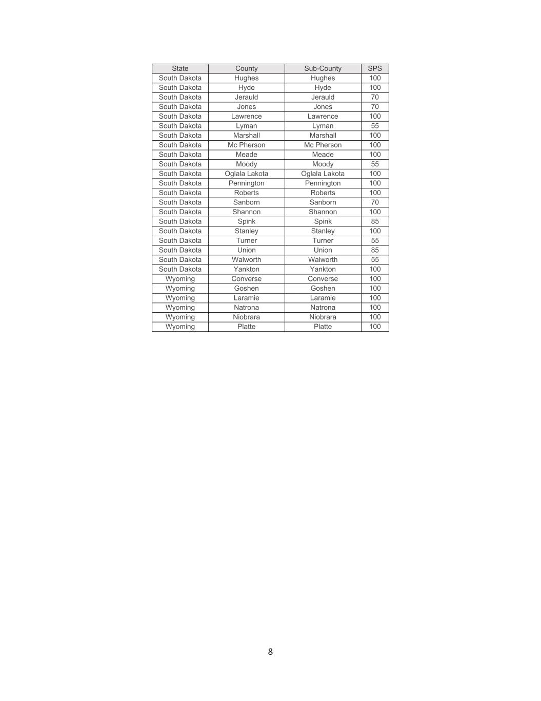 8    State County Sub-County SPS South Dakota Hughes Hughes 100 South Dakota Hyde Hyde 100 South Dakota Jerauld Jerauld 70 South Dakota Jones Jones 70 South Dakota Lawrence Lawrence 100 South Dakota Lyman Lyman 55 South Dakota Marshall Marshall 100 South Dakota Mc Pherson Mc Pherson 100 South Dakota Meade Meade 100 South Dakota Moody Moody 55 South Dakota Oglala Lakota Oglala Lakota 100 South Dakota Pennington Pennington 100 South Dakota Roberts Roberts 100 South Dakota Sanborn Sanborn 70 South Dakota Shannon Shannon 100 South Dakota Spink Spink 85 South Dakota Stanley Stanley 100 South Dakota Turner Turner 55 South Dakota Union Union 85 South Dakota Walworth Walworth 55 South Dakota Yankton Yankton 100 Wyoming Converse Converse 100 Wyoming Goshen Goshen 100 Wyoming Laramie Laramie 100 Wyoming Natrona Natrona 100 Wyoming Niobrara Niobrara 100 Wyoming Platte Platte 100