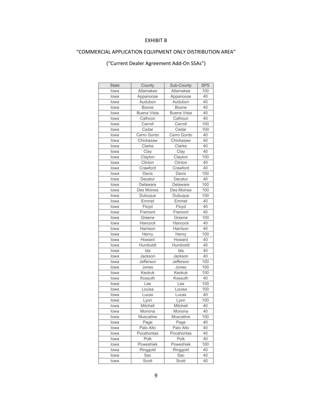 9    EXHIBIT B  “COMMERCIAL APPLICATION EQUIPMENT ONLY DISTRIBUTION AREA”  (“Current Dealer Agreement Add‐On SSAs”)    State County Sub-County SPS Iowa Allamakee Allamakee 100 Iowa Appanoose Appanoose 40 Iowa Audubon Audubon 40 Iowa Boone Boone 40 Iowa Buena Vista Buena Vista 40 Iowa Calhoun Calhoun 40 Iowa Carroll Carroll 100 Iowa Cedar Cedar 100 Iowa Cerro Gordo Cerro Gordo 40 Iowa Chickasaw Chickasaw 40 Iowa Clarke Clarke 40 Iowa Clay Clay 40 Iowa Clayton Clayton 100 Iowa Clinton Clinton 40 Iowa Crawford Crawford 40 Iowa Davis Davis 100 Iowa Decatur Decatur 40 Iowa Delaware Delaware 100 Iowa Des Moines Des Moines 100 Iowa Dubuque Dubuque 100 Iowa Emmet Emmet 40 Iowa Floyd Floyd 40 Iowa Fremont Fremont 40 Iowa Greene Greene 100 Iowa Hancock Hancock 40 Iowa Harrison Harrison 40 Iowa Henry Henry 100 Iowa Howard Howard 40 Iowa Humboldt Humboldt 40 Iowa Ida Ida 40 Iowa Jackson Jackson 40 Iowa Jefferson Jefferson 100 Iowa Jones Jones 100 Iowa Keokuk Keokuk 100 Iowa Kossuth Kossuth 40 Iowa Lee Lee 100 Iowa Louisa Louisa 100 Iowa Lucas Lucas 40 Iowa Lyon Lyon 100 Iowa Mitchell Mitchell 40 Iowa Monona Monona 40 Iowa Muscatine Muscatine 100 Iowa Page Page 40 Iowa Palo Alto Palo Alto 40 Iowa Pocahontas Pocahontas 40 Iowa Polk Polk 40 Iowa Poweshiek Poweshiek 100 Iowa Ringgold Ringgold 40 Iowa Sac Sac 40 Iowa Scott Scott 40