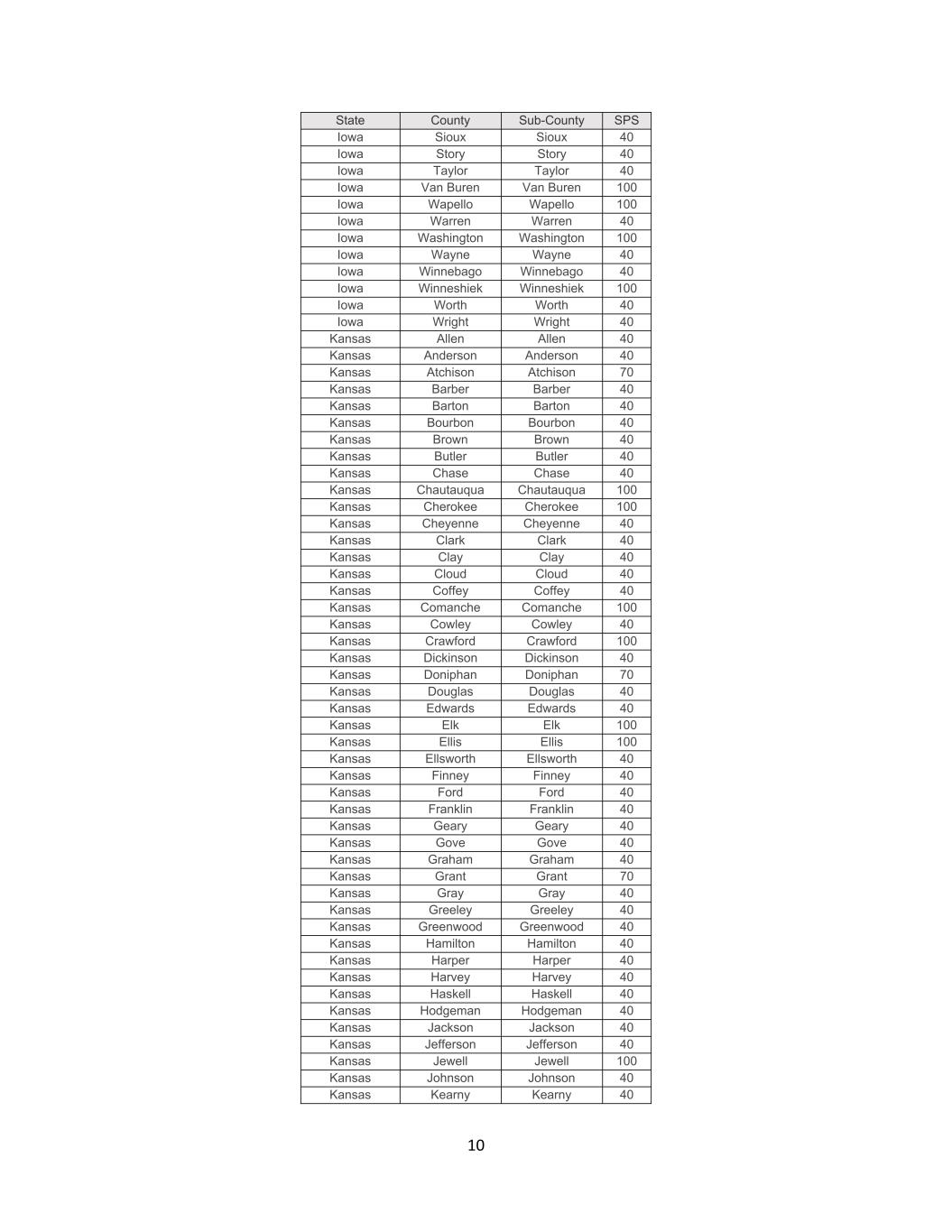 10    State County Sub-County SPS Iowa Sioux Sioux 40 Iowa Story Story 40 Iowa Taylor Taylor 40 Iowa Van Buren Van Buren 100 Iowa Wapello Wapello 100 Iowa Warren Warren 40 Iowa Washington Washington 100 Iowa Wayne Wayne 40 Iowa Winnebago Winnebago 40 Iowa Winneshiek Winneshiek 100 Iowa Worth Worth 40 Iowa Wright Wright 40 Kansas Allen Allen 40 Kansas Anderson Anderson 40 Kansas Atchison Atchison 70 Kansas Barber Barber 40 Kansas Barton Barton 40 Kansas Bourbon Bourbon 40 Kansas Brown Brown 40 Kansas Butler Butler 40 Kansas Chase Chase 40 Kansas Chautauqua Chautauqua 100 Kansas Cherokee Cherokee 100 Kansas Cheyenne Cheyenne 40 Kansas Clark Clark 40 Kansas Clay Clay 40 Kansas Cloud Cloud 40 Kansas Coffey Coffey 40 Kansas Comanche Comanche 100 Kansas Cowley Cowley 40 Kansas Crawford Crawford 100 Kansas Dickinson Dickinson 40 Kansas Doniphan Doniphan 70 Kansas Douglas Douglas 40 Kansas Edwards Edwards 40 Kansas Elk Elk 100 Kansas Ellis Ellis 100 Kansas Ellsworth Ellsworth 40 Kansas Finney Finney 40 Kansas Ford Ford 40 Kansas Franklin Franklin 40 Kansas Geary Geary 40 Kansas Gove Gove 40 Kansas Graham Graham 40 Kansas Grant Grant 70 Kansas Gray Gray 40 Kansas Greeley Greeley 40 Kansas Greenwood Greenwood 40 Kansas Hamilton Hamilton 40 Kansas Harper Harper 40 Kansas Harvey Harvey 40 Kansas Haskell Haskell 40 Kansas Hodgeman Hodgeman 40 Kansas Jackson Jackson 40 Kansas Jefferson Jefferson 40 Kansas Jewell Jewell 100 Kansas Johnson Johnson 40 Kansas Kearny Kearny 40