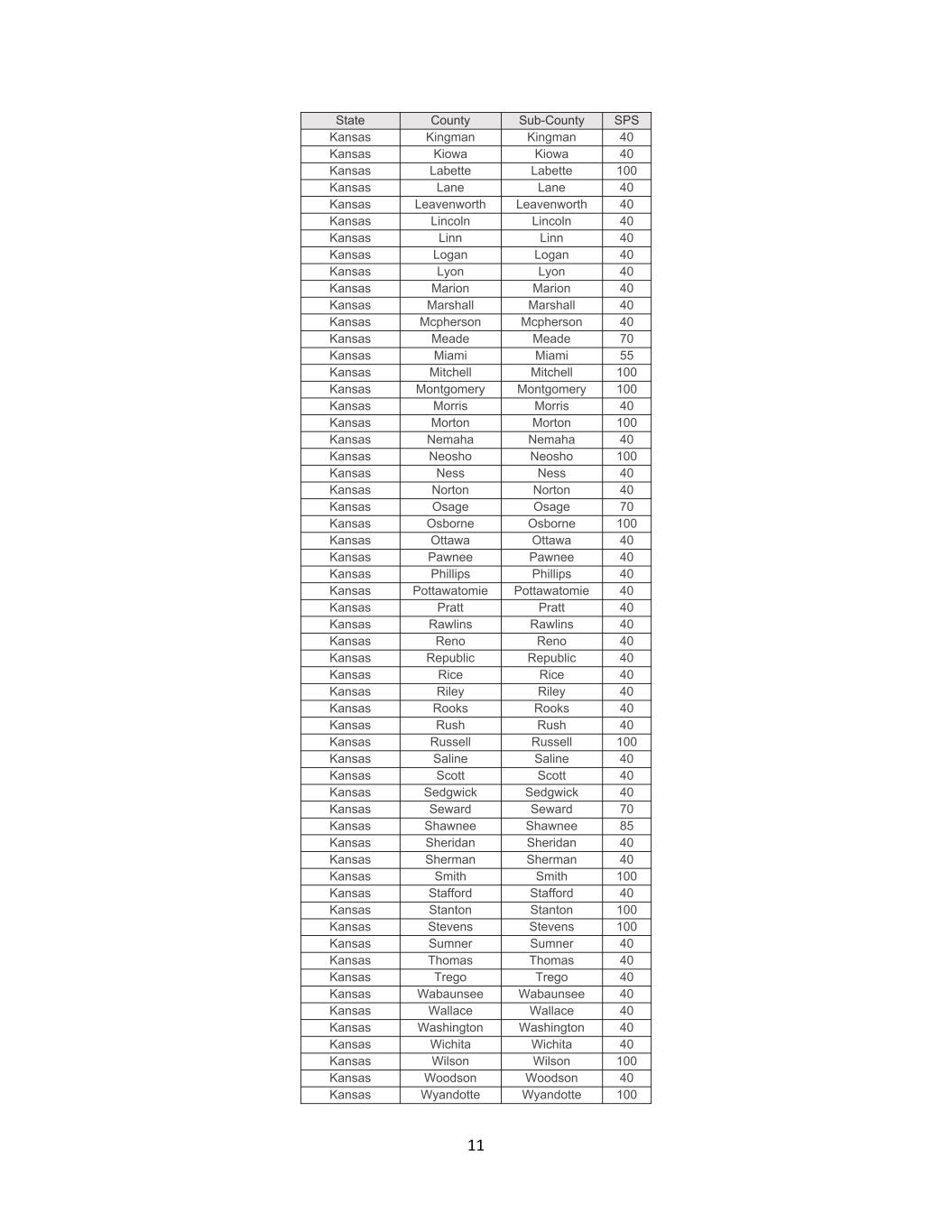 11    State County Sub-County SPS Kansas Kingman Kingman 40 Kansas Kiowa Kiowa 40 Kansas Labette Labette 100 Kansas Lane Lane 40 Kansas Leavenworth Leavenworth 40 Kansas Lincoln Lincoln 40 Kansas Linn Linn 40 Kansas Logan Logan 40 Kansas Lyon Lyon 40 Kansas Marion Marion 40 Kansas Marshall Marshall 40 Kansas Mcpherson Mcpherson 40 Kansas Meade Meade 70 Kansas Miami Miami 55 Kansas Mitchell Mitchell 100 Kansas Montgomery Montgomery 100 Kansas Morris Morris 40 Kansas Morton Morton 100 Kansas Nemaha Nemaha 40 Kansas Neosho Neosho 100 Kansas Ness Ness 40 Kansas Norton Norton 40 Kansas Osage Osage 70 Kansas Osborne Osborne 100 Kansas Ottawa Ottawa 40 Kansas Pawnee Pawnee 40 Kansas Phillips Phillips 40 Kansas Pottawatomie Pottawatomie 40 Kansas Pratt Pratt 40 Kansas Rawlins Rawlins 40 Kansas Reno Reno 40 Kansas Republic Republic 40 Kansas Rice Rice 40 Kansas Riley Riley 40 Kansas Rooks Rooks 40 Kansas Rush Rush 40 Kansas Russell Russell 100 Kansas Saline Saline 40 Kansas Scott Scott 40 Kansas Sedgwick Sedgwick 40 Kansas Seward Seward 70 Kansas Shawnee Shawnee 85 Kansas Sheridan Sheridan 40 Kansas Sherman Sherman 40 Kansas Smith Smith 100 Kansas Stafford Stafford 40 Kansas Stanton Stanton 100 Kansas Stevens Stevens 100 Kansas Sumner Sumner 40 Kansas Thomas Thomas 40 Kansas Trego Trego 40 Kansas Wabaunsee Wabaunsee 40 Kansas Wallace Wallace 40 Kansas Washington Washington 40 Kansas Wichita Wichita 40 Kansas Wilson Wilson 100 Kansas Woodson Woodson 40 Kansas Wyandotte Wyandotte 100