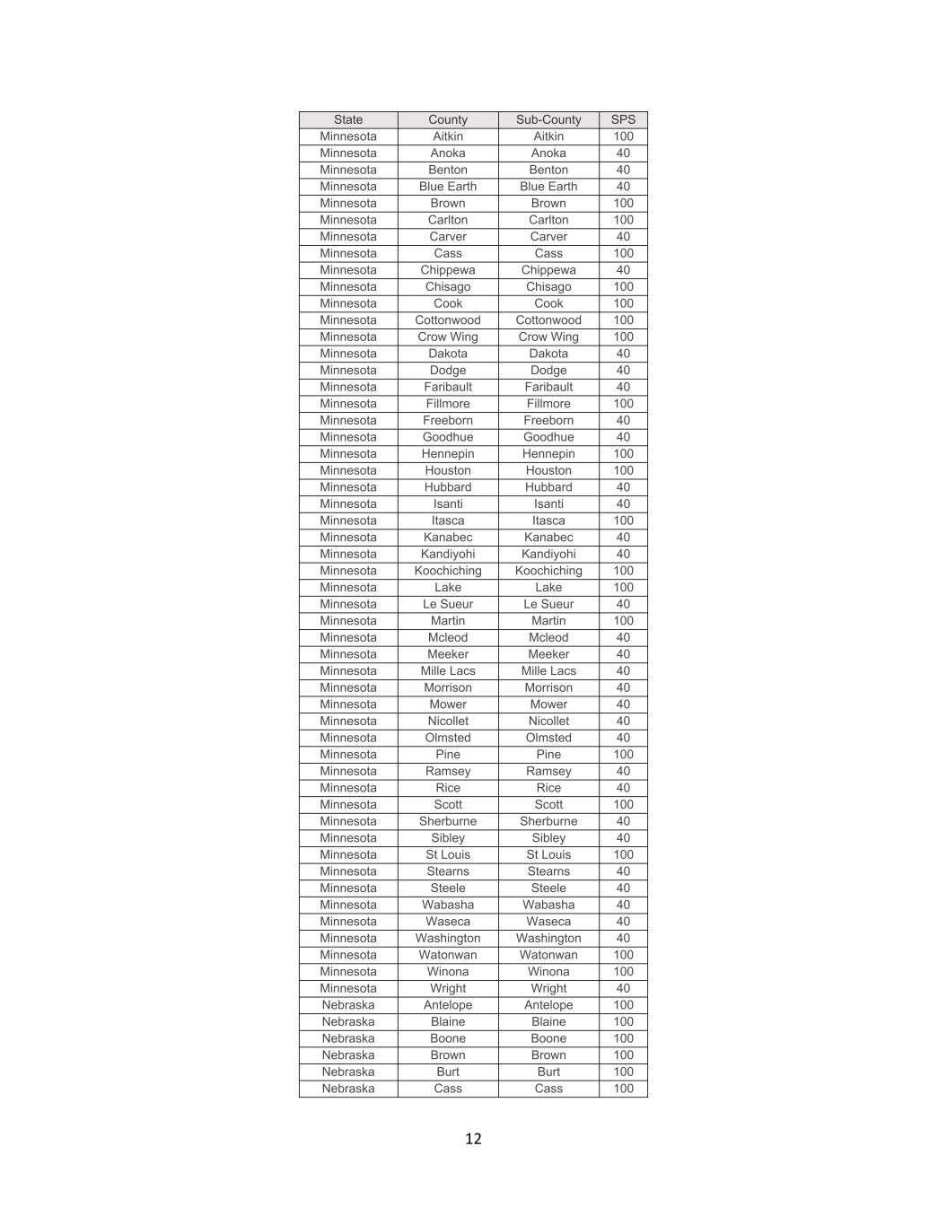 12    State County Sub-County SPS Minnesota Aitkin Aitkin 100 Minnesota Anoka Anoka 40 Minnesota Benton Benton 40 Minnesota Blue Earth Blue Earth 40 Minnesota Brown Brown 100 Minnesota Carlton Carlton 100 Minnesota Carver Carver 40 Minnesota Cass Cass 100 Minnesota Chippewa Chippewa 40 Minnesota Chisago Chisago 100 Minnesota Cook Cook 100 Minnesota Cottonwood Cottonwood 100 Minnesota Crow Wing Crow Wing 100 Minnesota Dakota Dakota 40 Minnesota Dodge Dodge 40 Minnesota Faribault Faribault 40 Minnesota Fillmore Fillmore 100 Minnesota Freeborn Freeborn 40 Minnesota Goodhue Goodhue 40 Minnesota Hennepin Hennepin 100 Minnesota Houston Houston 100 Minnesota Hubbard Hubbard 40 Minnesota Isanti Isanti 40 Minnesota Itasca Itasca 100 Minnesota Kanabec Kanabec 40 Minnesota Kandiyohi Kandiyohi 40 Minnesota Koochiching Koochiching 100 Minnesota Lake Lake 100 Minnesota Le Sueur Le Sueur 40 Minnesota Martin Martin 100 Minnesota Mcleod Mcleod 40 Minnesota Meeker Meeker 40 Minnesota Mille Lacs Mille Lacs 40 Minnesota Morrison Morrison 40 Minnesota Mower Mower 40 Minnesota Nicollet Nicollet 40 Minnesota Olmsted Olmsted 40 Minnesota Pine Pine 100 Minnesota Ramsey Ramsey 40 Minnesota Rice Rice 40 Minnesota Scott Scott 100 Minnesota Sherburne Sherburne 40 Minnesota Sibley Sibley 40 Minnesota St Louis St Louis 100 Minnesota Stearns Stearns 40 Minnesota Steele Steele 40 Minnesota Wabasha Wabasha 40 Minnesota Waseca Waseca 40 Minnesota Washington Washington 40 Minnesota Watonwan Watonwan 100 Minnesota Winona Winona 100 Minnesota Wright Wright 40 Nebraska Antelope Antelope 100 Nebraska Blaine Blaine 100 Nebraska Boone Boone 100 Nebraska Brown Brown 100 Nebraska Burt Burt 100 Nebraska Cass Cass 100