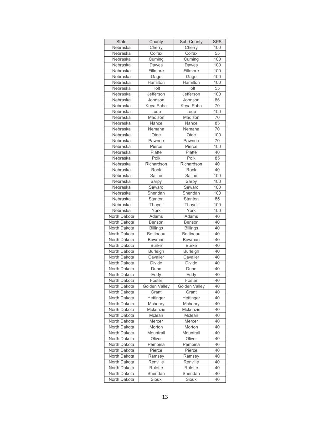 13    State County Sub-County SPS Nebraska Cherry Cherry 100 Nebraska Colfax Colfax 55 Nebraska Cuming Cuming 100 Nebraska Dawes Dawes 100 Nebraska Fillmore Fillmore 100 Nebraska Gage Gage 100 Nebraska Hamilton Hamilton 100 Nebraska Holt Holt 55 Nebraska Jefferson Jefferson 100 Nebraska Johnson Johnson 85 Nebraska Keya Paha Keya Paha 70 Nebraska Loup Loup 100 Nebraska Madison Madison 70 Nebraska Nance Nance 85 Nebraska Nemaha Nemaha 70 Nebraska Otoe Otoe 100 Nebraska Pawnee Pawnee 70 Nebraska Pierce Pierce 100 Nebraska Platte Platte 40 Nebraska Polk Polk 85 Nebraska Richardson Richardson 40 Nebraska Rock Rock 40 Nebraska Saline Saline 100 Nebraska Sarpy Sarpy 100 Nebraska Seward Seward 100 Nebraska Sheridan Sheridan 100 Nebraska Stanton Stanton 85 Nebraska Thayer Thayer 100 Nebraska York York 100 North Dakota Adams Adams 40 North Dakota Benson Benson 40 North Dakota Billings Billings 40 North Dakota Bottineau Bottineau 40 North Dakota Bowman Bowman 40 North Dakota Burke Burke 40 North Dakota Burleigh Burleigh 40 North Dakota Cavalier Cavalier 40 North Dakota Divide Divide 40 North Dakota Dunn Dunn 40 North Dakota Eddy Eddy 40 North Dakota Foster Foster 40 North Dakota Golden Valley Golden Valley 40 North Dakota Grant Grant 40 North Dakota Hettinger Hettinger 40 North Dakota Mchenry Mchenry 40 North Dakota Mckenzie Mckenzie 40 North Dakota Mclean Mclean 40 North Dakota Mercer Mercer 40 North Dakota Morton Morton 40 North Dakota Mountrail Mountrail 40 North Dakota Oliver Oliver 40 North Dakota Pembina Pembina 40 North Dakota Pierce Pierce 40 North Dakota Ramsey Ramsey 40 North Dakota Renville Renville 40 North Dakota Rolette Rolette 40 North Dakota Sheridan Sheridan 40 North Dakota Sioux Sioux 40