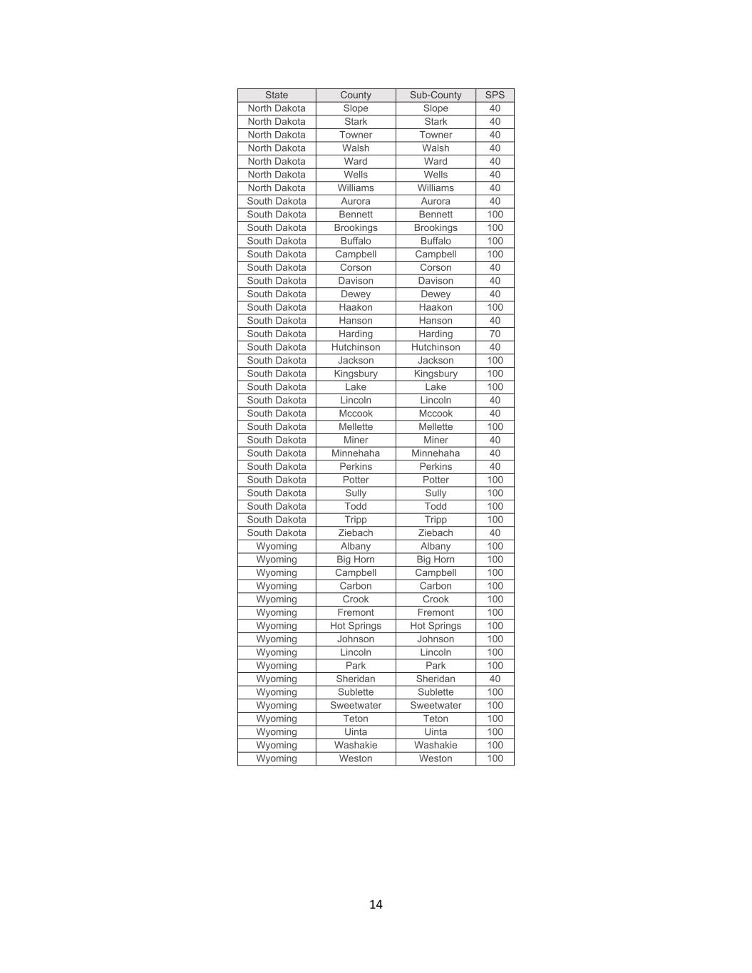 14    State County Sub-County SPS North Dakota Slope Slope 40 North Dakota Stark Stark 40 North Dakota Towner Towner 40 North Dakota Walsh Walsh 40 North Dakota Ward Ward 40 North Dakota Wells Wells 40 North Dakota Williams Williams 40 South Dakota Aurora Aurora 40 South Dakota Bennett Bennett 100 South Dakota Brookings Brookings 100 South Dakota Buffalo Buffalo 100 South Dakota Campbell Campbell 100 South Dakota Corson Corson 40 South Dakota Davison Davison 40 South Dakota Dewey Dewey 40 South Dakota Haakon Haakon 100 South Dakota Hanson Hanson 40 South Dakota Harding Harding 70 South Dakota Hutchinson Hutchinson 40 South Dakota Jackson Jackson 100 South Dakota Kingsbury Kingsbury 100 South Dakota Lake Lake 100 South Dakota Lincoln Lincoln 40 South Dakota Mccook Mccook 40 South Dakota Mellette Mellette 100 South Dakota Miner Miner 40 South Dakota Minnehaha Minnehaha 40 South Dakota Perkins Perkins 40 South Dakota Potter Potter 100 South Dakota Sully Sully 100 South Dakota Todd Todd 100 South Dakota Tripp Tripp 100 South Dakota Ziebach Ziebach 40 Wyoming Albany Albany 100 Wyoming Big Horn Big Horn 100 Wyoming Campbell Campbell 100 Wyoming Carbon Carbon 100 Wyoming Crook Crook 100 Wyoming Fremont Fremont 100 Wyoming Hot Springs Hot Springs 100 Wyoming Johnson Johnson 100 Wyoming Lincoln Lincoln 100 Wyoming Park Park 100 Wyoming Sheridan Sheridan 40 Wyoming Sublette Sublette 100 Wyoming Sweetwater Sweetwater 100 Wyoming Teton Teton 100 Wyoming Uinta Uinta 100 Wyoming Washakie Washakie 100 Wyoming Weston Weston 100