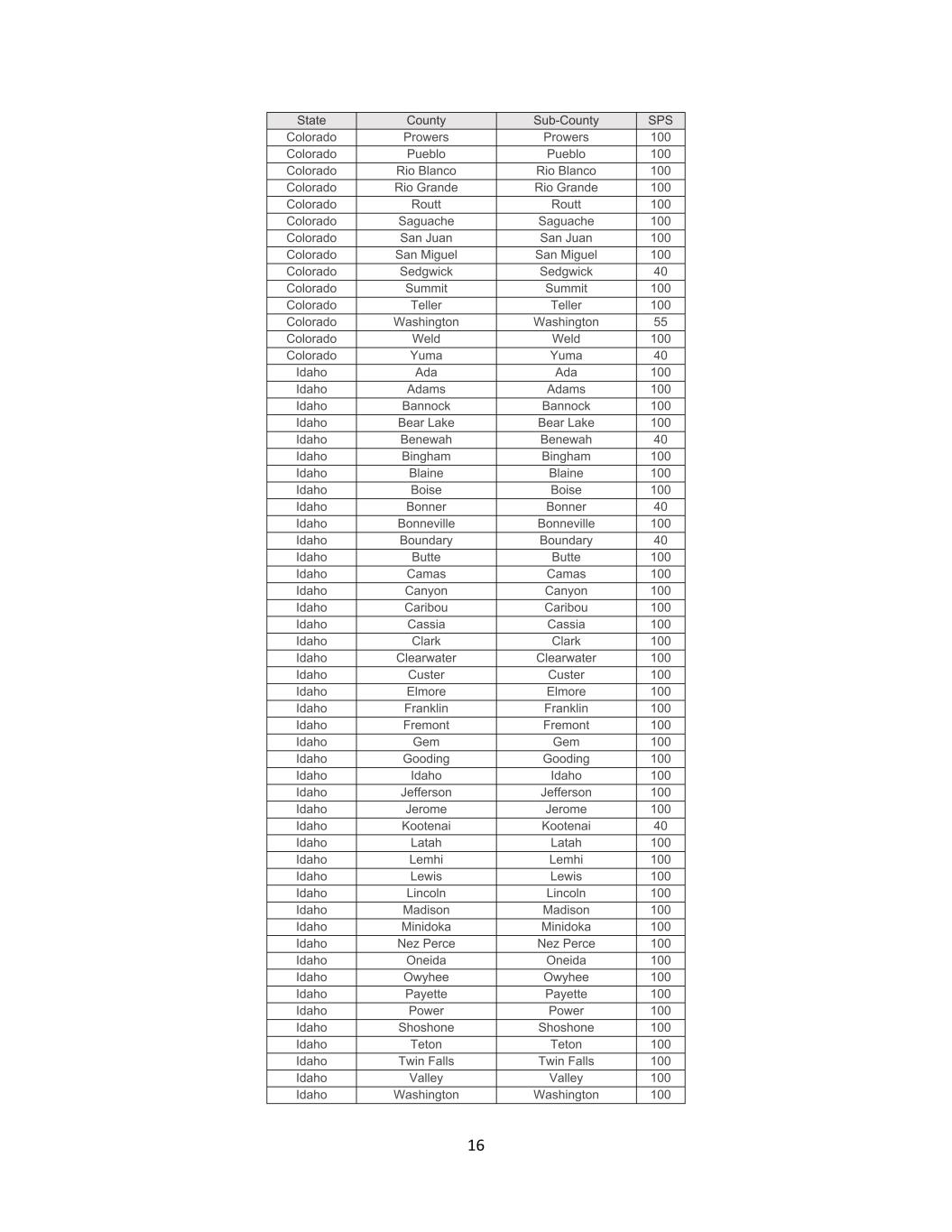 16    State County Sub-County SPS Colorado Prowers Prowers 100 Colorado Pueblo Pueblo 100 Colorado Rio Blanco Rio Blanco 100 Colorado Rio Grande Rio Grande 100 Colorado Routt Routt 100 Colorado Saguache Saguache 100 Colorado San Juan San Juan 100 Colorado San Miguel San Miguel 100 Colorado Sedgwick Sedgwick 40 Colorado Summit Summit 100 Colorado Teller Teller 100 Colorado Washington Washington 55 Colorado Weld Weld 100 Colorado Yuma Yuma 40 Idaho Ada Ada 100 Idaho Adams Adams 100 Idaho Bannock Bannock 100 Idaho Bear Lake Bear Lake 100 Idaho Benewah Benewah 40 Idaho Bingham Bingham 100 Idaho Blaine Blaine 100 Idaho Boise Boise 100 Idaho Bonner Bonner 40 Idaho Bonneville Bonneville 100 Idaho Boundary Boundary 40 Idaho Butte Butte 100 Idaho Camas Camas 100 Idaho Canyon Canyon 100 Idaho Caribou Caribou 100 Idaho Cassia Cassia 100 Idaho Clark Clark 100 Idaho Clearwater Clearwater 100 Idaho Custer Custer 100 Idaho Elmore Elmore 100 Idaho Franklin Franklin 100 Idaho Fremont Fremont 100 Idaho Gem Gem 100 Idaho Gooding Gooding 100 Idaho Idaho Idaho 100 Idaho Jefferson Jefferson 100 Idaho Jerome Jerome 100 Idaho Kootenai Kootenai 40 Idaho Latah Latah 100 Idaho Lemhi Lemhi 100 Idaho Lewis Lewis 100 Idaho Lincoln Lincoln 100 Idaho Madison Madison 100 Idaho Minidoka Minidoka 100 Idaho Nez Perce Nez Perce 100 Idaho Oneida Oneida 100 Idaho Owyhee Owyhee 100 Idaho Payette Payette 100 Idaho Power Power 100 Idaho Shoshone Shoshone 100 Idaho Teton Teton 100 Idaho Twin Falls Twin Falls 100 Idaho Valley Valley 100 Idaho Washington Washington 100