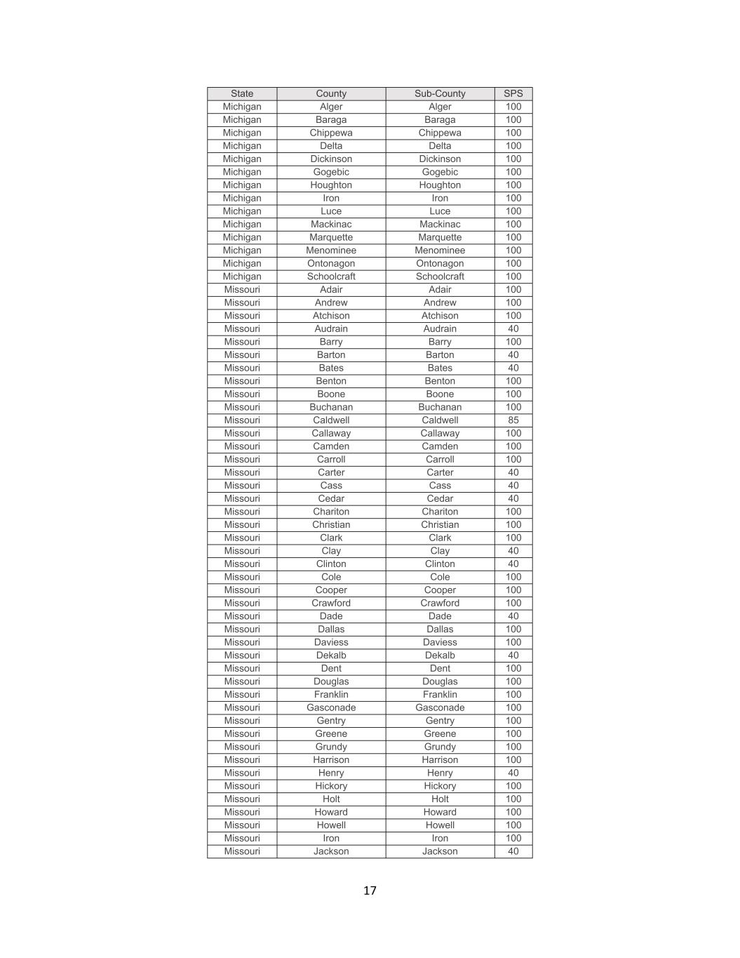 17    State County Sub-County SPS Michigan Alger Alger 100 Michigan Baraga Baraga 100 Michigan Chippewa Chippewa 100 Michigan Delta Delta 100 Michigan Dickinson Dickinson 100 Michigan Gogebic Gogebic 100 Michigan Houghton Houghton 100 Michigan Iron Iron 100 Michigan Luce Luce 100 Michigan Mackinac Mackinac 100 Michigan Marquette Marquette 100 Michigan Menominee Menominee 100 Michigan Ontonagon Ontonagon 100 Michigan Schoolcraft Schoolcraft 100 Missouri Adair Adair 100 Missouri Andrew Andrew 100 Missouri Atchison Atchison 100 Missouri Audrain Audrain 40 Missouri Barry Barry 100 Missouri Barton Barton 40 Missouri Bates Bates 40 Missouri Benton Benton 100 Missouri Boone Boone 100 Missouri Buchanan Buchanan 100 Missouri Caldwell Caldwell 85 Missouri Callaway Callaway 100 Missouri Camden Camden 100 Missouri Carroll Carroll 100 Missouri Carter Carter 40 Missouri Cass Cass 40 Missouri Cedar Cedar 40 Missouri Chariton Chariton 100 Missouri Christian Christian 100 Missouri Clark Clark 100 Missouri Clay Clay 40 Missouri Clinton Clinton 40 Missouri Cole Cole 100 Missouri Cooper Cooper 100 Missouri Crawford Crawford 100 Missouri Dade Dade 40 Missouri Dallas Dallas 100 Missouri Daviess Daviess 100 Missouri Dekalb Dekalb 40 Missouri Dent Dent 100 Missouri Douglas Douglas 100 Missouri Franklin Franklin 100 Missouri Gasconade Gasconade 100 Missouri Gentry Gentry 100 Missouri Greene Greene 100 Missouri Grundy Grundy 100 Missouri Harrison Harrison 100 Missouri Henry Henry 40 Missouri Hickory Hickory 100 Missouri Holt Holt 100 Missouri Howard Howard 100 Missouri Howell Howell 100 Missouri Iron Iron 100 Missouri Jackson Jackson 40