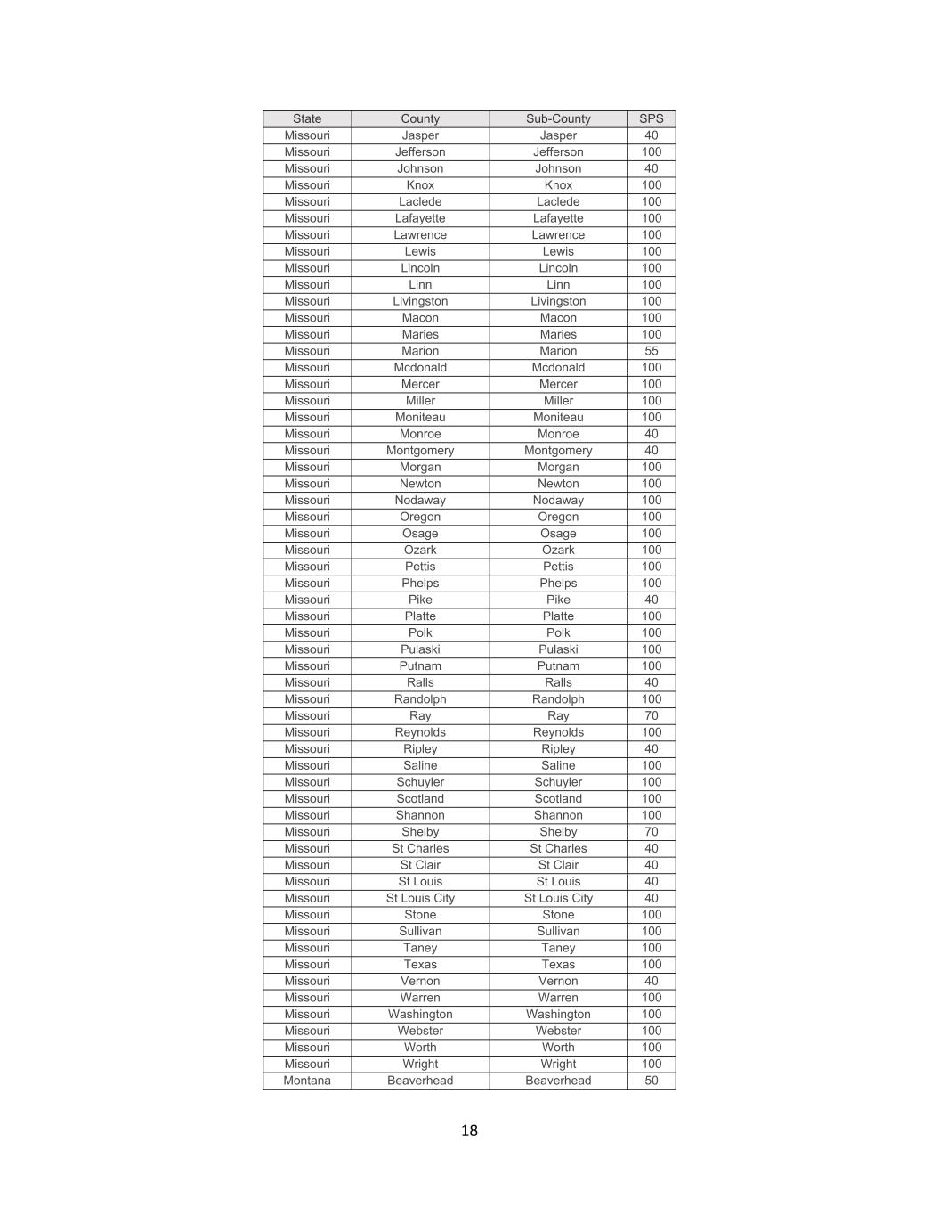 18    State County Sub-County SPS Missouri Jasper Jasper 40 Missouri Jefferson Jefferson 100 Missouri Johnson Johnson 40 Missouri Knox Knox 100 Missouri Laclede Laclede 100 Missouri Lafayette Lafayette 100 Missouri Lawrence Lawrence 100 Missouri Lewis Lewis 100 Missouri Lincoln Lincoln 100 Missouri Linn Linn 100 Missouri Livingston Livingston 100 Missouri Macon Macon 100 Missouri Maries Maries 100 Missouri Marion Marion 55 Missouri Mcdonald Mcdonald 100 Missouri Mercer Mercer 100 Missouri Miller Miller 100 Missouri Moniteau Moniteau 100 Missouri Monroe Monroe 40 Missouri Montgomery Montgomery 40 Missouri Morgan Morgan 100 Missouri Newton Newton 100 Missouri Nodaway Nodaway 100 Missouri Oregon Oregon 100 Missouri Osage Osage 100 Missouri Ozark Ozark 100 Missouri Pettis Pettis 100 Missouri Phelps Phelps 100 Missouri Pike Pike 40 Missouri Platte Platte 100 Missouri Polk Polk 100 Missouri Pulaski Pulaski 100 Missouri Putnam Putnam 100 Missouri Ralls Ralls 40 Missouri Randolph Randolph 100 Missouri Ray Ray 70 Missouri Reynolds Reynolds 100 Missouri Ripley Ripley 40 Missouri Saline Saline 100 Missouri Schuyler Schuyler 100 Missouri Scotland Scotland 100 Missouri Shannon Shannon 100 Missouri Shelby Shelby 70 Missouri St Charles St Charles 40 Missouri St Clair St Clair 40 Missouri St Louis St Louis 40 Missouri St Louis City St Louis City 40 Missouri Stone Stone 100 Missouri Sullivan Sullivan 100 Missouri Taney Taney 100 Missouri Texas Texas 100 Missouri Vernon Vernon 40 Missouri Warren Warren 100 Missouri Washington Washington 100 Missouri Webster Webster 100 Missouri Worth Worth 100 Missouri Wright Wright 100 Montana Beaverhead Beaverhead 50