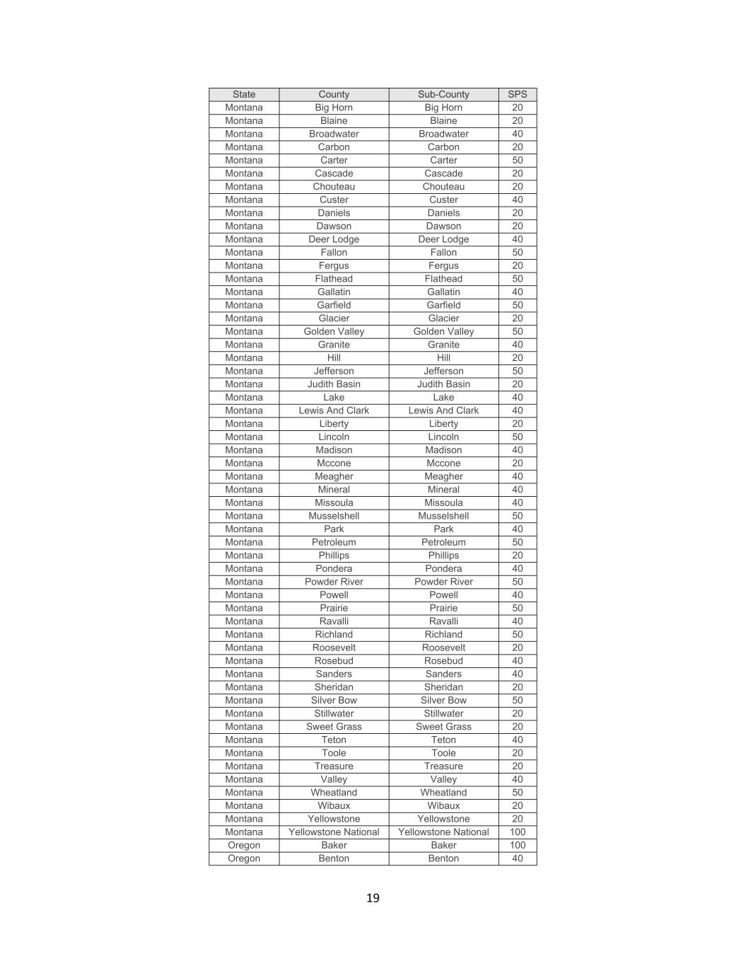 19    State County Sub-County SPS Montana Big Horn Big Horn 20 Montana Blaine Blaine 20 Montana Broadwater Broadwater 40 Montana Carbon Carbon 20 Montana Carter Carter 50 Montana Cascade Cascade 20 Montana Chouteau Chouteau 20 Montana Custer Custer 40 Montana Daniels Daniels 20 Montana Dawson Dawson 20 Montana Deer Lodge Deer Lodge 40 Montana Fallon Fallon 50 Montana Fergus Fergus 20 Montana Flathead Flathead 50 Montana Gallatin Gallatin 40 Montana Garfield Garfield 50 Montana Glacier Glacier 20 Montana Golden Valley Golden Valley 50 Montana Granite Granite 40 Montana Hill Hill 20 Montana Jefferson Jefferson 50 Montana Judith Basin Judith Basin 20 Montana Lake Lake 40 Montana Lewis And Clark Lewis And Clark 40 Montana Liberty Liberty 20 Montana Lincoln Lincoln 50 Montana Madison Madison 40 Montana Mccone Mccone 20 Montana Meagher Meagher 40 Montana Mineral Mineral 40 Montana Missoula Missoula 40 Montana Musselshell Musselshell 50 Montana Park Park 40 Montana Petroleum Petroleum 50 Montana Phillips Phillips 20 Montana Pondera Pondera 40 Montana Powder River Powder River 50 Montana Powell Powell 40 Montana Prairie Prairie 50 Montana Ravalli Ravalli 40 Montana Richland Richland 50 Montana Roosevelt Roosevelt 20 Montana Rosebud Rosebud 40 Montana Sanders Sanders 40 Montana Sheridan Sheridan 20 Montana Silver Bow Silver Bow 50 Montana Stillwater Stillwater 20 Montana Sweet Grass Sweet Grass 20 Montana Teton Teton 40 Montana Toole Toole 20 Montana Treasure Treasure 20 Montana Valley Valley 40 Montana Wheatland Wheatland 50 Montana Wibaux Wibaux 20 Montana Yellowstone Yellowstone 20 Montana Yellowstone National Yellowstone National 100 Oregon Baker Baker 100 Oregon Benton Benton 40