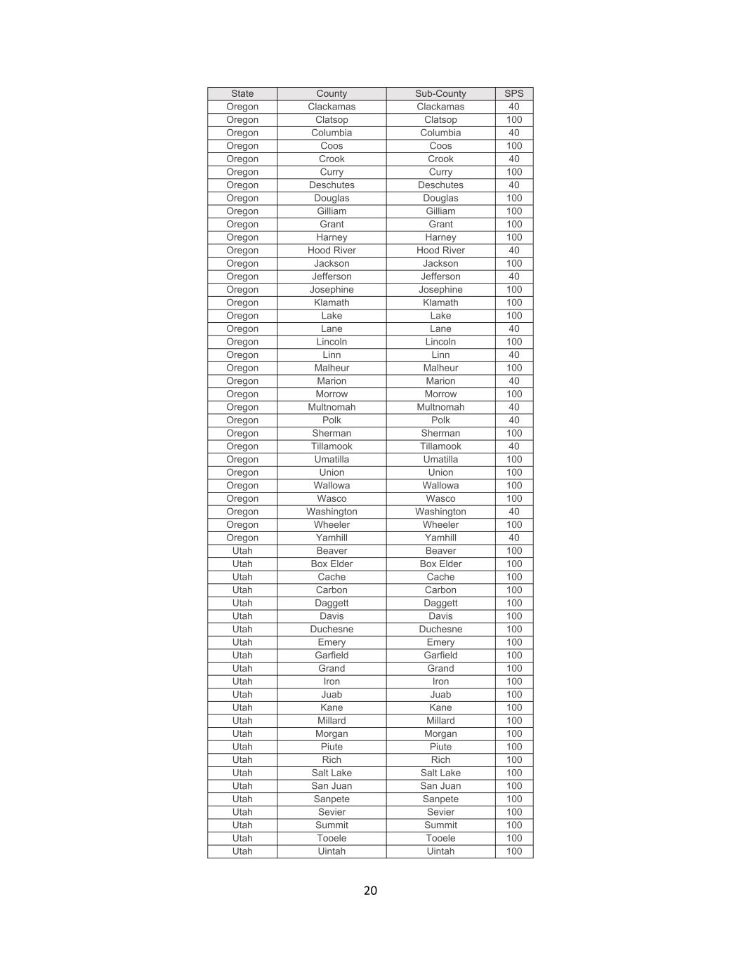 20    State County Sub-County SPS Oregon Clackamas Clackamas 40 Oregon Clatsop Clatsop 100 Oregon Columbia Columbia 40 Oregon Coos Coos 100 Oregon Crook Crook 40 Oregon Curry Curry 100 Oregon Deschutes Deschutes 40 Oregon Douglas Douglas 100 Oregon Gilliam Gilliam 100 Oregon Grant Grant 100 Oregon Harney Harney 100 Oregon Hood River Hood River 40 Oregon Jackson Jackson 100 Oregon Jefferson Jefferson 40 Oregon Josephine Josephine 100 Oregon Klamath Klamath 100 Oregon Lake Lake 100 Oregon Lane Lane 40 Oregon Lincoln Lincoln 100 Oregon Linn Linn 40 Oregon Malheur Malheur 100 Oregon Marion Marion 40 Oregon Morrow Morrow 100 Oregon Multnomah Multnomah 40 Oregon Polk Polk 40 Oregon Sherman Sherman 100 Oregon Tillamook Tillamook 40 Oregon Umatilla Umatilla 100 Oregon Union Union 100 Oregon Wallowa Wallowa 100 Oregon Wasco Wasco 100 Oregon Washington Washington 40 Oregon Wheeler Wheeler 100 Oregon Yamhill Yamhill 40 Utah Beaver Beaver 100 Utah Box Elder Box Elder 100 Utah Cache Cache 100 Utah Carbon Carbon 100 Utah Daggett Daggett 100 Utah Davis Davis 100 Utah Duchesne Duchesne 100 Utah Emery Emery 100 Utah Garfield Garfield 100 Utah Grand Grand 100 Utah Iron Iron 100 Utah Juab Juab 100 Utah Kane Kane 100 Utah Millard Millard 100 Utah Morgan Morgan 100 Utah Piute Piute 100 Utah Rich Rich 100 Utah Salt Lake Salt Lake 100 Utah San Juan San Juan 100 Utah Sanpete Sanpete 100 Utah Sevier Sevier 100 Utah Summit Summit 100 Utah Tooele Tooele 100 Utah Uintah Uintah 100
