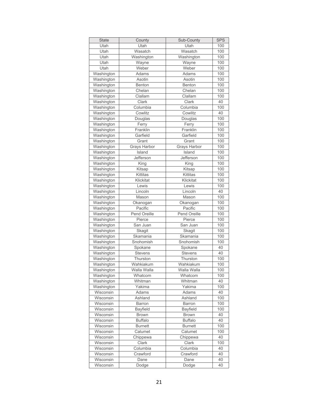 21    State County Sub-County SPS Utah Utah Utah 100 Utah Wasatch Wasatch 100 Utah Washington Washington 100 Utah Wayne Wayne 100 Utah Weber Weber 100 Washington Adams Adams 100 Washington Asotin Asotin 100 Washington Benton Benton 100 Washington Chelan Chelan 100 Washington Clallam Clallam 100 Washington Clark Clark 40 Washington Columbia Columbia 100 Washington Cowlitz Cowlitz 40 Washington Douglas Douglas 100 Washington Ferry Ferry 100 Washington Franklin Franklin 100 Washington Garfield Garfield 100 Washington Grant Grant 100 Washington Grays Harbor Grays Harbor 100 Washington Island Island 100 Washington Jefferson Jefferson 100 Washington King King 100 Washington Kitsap Kitsap 100 Washington Kittitas Kittitas 100 Washington Klickitat Klickitat 100 Washington Lewis Lewis 100 Washington Lincoln Lincoln 40 Washington Mason Mason 100 Washington Okanogan Okanogan 100 Washington Pacific Pacific 100 Washington Pend Oreille Pend Oreille 100 Washington Pierce Pierce 100 Washington San Juan San Juan 100 Washington Skagit Skagit 100 Washington Skamania Skamania 100 Washington Snohomish Snohomish 100 Washington Spokane Spokane 40 Washington Stevens Stevens 40 Washington Thurston Thurston 100 Washington Wahkiakum Wahkiakum 100 Washington Walla Walla Walla Walla 100 Washington Whatcom Whatcom 100 Washington Whitman Whitman 40 Washington Yakima Yakima 100 Wisconsin Adams Adams 40 Wisconsin Ashland Ashland 100 Wisconsin Barron Barron 100 Wisconsin Bayfield Bayfield 100 Wisconsin Brown Brown 40 Wisconsin Buffalo Buffalo 40 Wisconsin Burnett Burnett 100 Wisconsin Calumet Calumet 100 Wisconsin Chippewa Chippewa 40 Wisconsin Clark Clark 100 Wisconsin Columbia Columbia 40 Wisconsin Crawford Crawford 40 Wisconsin Dane Dane 40 Wisconsin Dodge Dodge 40