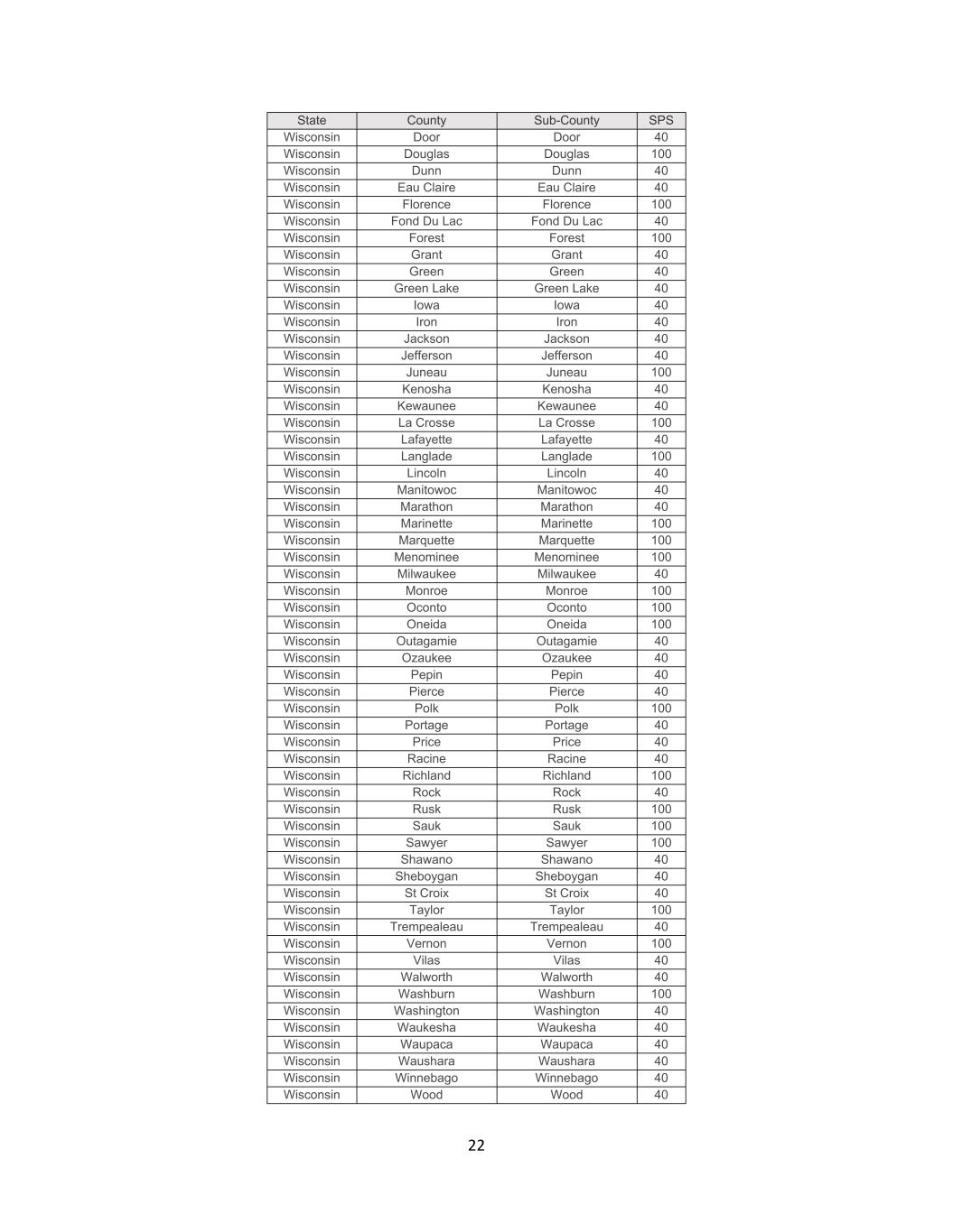 22    State County Sub-County SPS Wisconsin Door Door 40 Wisconsin Douglas Douglas 100 Wisconsin Dunn Dunn 40 Wisconsin Eau Claire Eau Claire 40 Wisconsin Florence Florence 100 Wisconsin Fond Du Lac Fond Du Lac 40 Wisconsin Forest Forest 100 Wisconsin Grant Grant 40 Wisconsin Green Green 40 Wisconsin Green Lake Green Lake 40 Wisconsin Iowa Iowa 40 Wisconsin Iron Iron 40 Wisconsin Jackson Jackson 40 Wisconsin Jefferson Jefferson 40 Wisconsin Juneau Juneau 100 Wisconsin Kenosha Kenosha 40 Wisconsin Kewaunee Kewaunee 40 Wisconsin La Crosse La Crosse 100 Wisconsin Lafayette Lafayette 40 Wisconsin Langlade Langlade 100 Wisconsin Lincoln Lincoln 40 Wisconsin Manitowoc Manitowoc 40 Wisconsin Marathon Marathon 40 Wisconsin Marinette Marinette 100 Wisconsin Marquette Marquette 100 Wisconsin Menominee Menominee 100 Wisconsin Milwaukee Milwaukee 40 Wisconsin Monroe Monroe 100 Wisconsin Oconto Oconto 100 Wisconsin Oneida Oneida 100 Wisconsin Outagamie Outagamie 40 Wisconsin Ozaukee Ozaukee 40 Wisconsin Pepin Pepin 40 Wisconsin Pierce Pierce 40 Wisconsin Polk Polk 100 Wisconsin Portage Portage 40 Wisconsin Price Price 40 Wisconsin Racine Racine 40 Wisconsin Richland Richland 100 Wisconsin Rock Rock 40 Wisconsin Rusk Rusk 100 Wisconsin Sauk Sauk 100 Wisconsin Sawyer Sawyer 100 Wisconsin Shawano Shawano 40 Wisconsin Sheboygan Sheboygan 40 Wisconsin St Croix St Croix 40 Wisconsin Taylor Taylor 100 Wisconsin Trempealeau Trempealeau 40 Wisconsin Vernon Vernon 100 Wisconsin Vilas Vilas 40 Wisconsin Walworth Walworth 40 Wisconsin Washburn Washburn 100 Wisconsin Washington Washington 40 Wisconsin Waukesha Waukesha 40 Wisconsin Waupaca Waupaca 40 Wisconsin Waushara Waushara 40 Wisconsin Winnebago Winnebago 40 Wisconsin Wood Wood 40