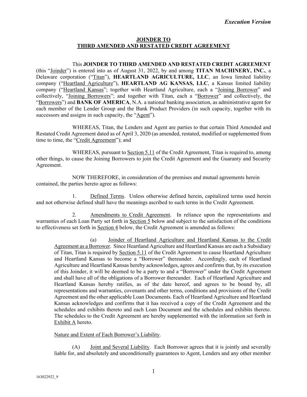 Execution Version 1 163022922_9 JOINDER TO THIRD AMENDED AND RESTATED CREDIT AGREEMENT This JOINDER TO THIRD AMENDED AND RESTATED CREDIT AGREEMENT (this “Joinder”) is entered into as of August 31, 2022, by and among TITAN MACHINERY, INC., a Delaware corporation (“Titan”), HEARTLAND AGRICULTURE, LLC, an Iowa limited liability company (“Heartland Agriculture”), HEARTLAND AG KANSAS, LLC, a Kansas limited liability company (“Heartland Kansas”; together with Heartland Agriculture, each a “Joining Borrower” and collectively, “Joining Borrowers”; and together with Titan, each a “Borrower” and collectively, the “Borrowers”) and BANK OF AMERICA, N.A. a national banking association, as administrative agent for each member of the Lender Group and the Bank Product Providers (in such capacity, together with its successors and assigns in such capacity, the “Agent”). WHEREAS, Titan, the Lenders and Agent are parties to that certain Third Amended and Restated Credit Agreement dated as of April 3, 2020 (as amended, restated, modified or supplemented from time to time, the “Credit Agreement”); and WHEREAS, pursuant to Section 5.11 of the Credit Agreement, Titan is required to, among other things, to cause the Joining Borrowers to join the Credit Agreement and the Guaranty and Security Agreement. NOW THEREFORE, in consideration of the premises and mutual agreements herein contained, the parties hereto agree as follows: 1. Defined Terms. Unless otherwise defined herein, capitalized terms used herein and not otherwise defined shall have the meanings ascribed to such terms in the Credit Agreement. 2. Amendments to Credit Agreement. In reliance upon the representations and warranties of each Loan Party set forth in Section 5 below and subject to the satisfaction of the conditions to effectiveness set forth in Section 4 below, the Credit Agreement is amended as follows: (a) Joinder of Heartland Agriculture and Heartland Kansas to the Credit Agreement as a Borrower. Since Heartland Agriculture and Heartland Kansas are each a Subsidiary of Titan, Titan is required by Section 5.11 of the Credit Agreement to cause Heartland Agriculture and Heartland Kansas to become a “Borrower” thereunder. Accordingly, each of Heartland Agriculture and Heartland Kansas hereby acknowledges, agrees and confirms that, by its execution of this Joinder, it will be deemed to be a party to and a “Borrower” under the Credit Agreement and shall have all of the obligations of a Borrower thereunder. Each of Heartland Agriculture and Heartland Kansas hereby ratifies, as of the date hereof, and agrees to be bound by, all representations and warranties, covenants and other terms, conditions and provisions of the Credit Agreement and the other applicable Loan Documents. Each of Heartland Agriculture and Heartland Kansas acknowledges and confirms that it has received a copy of the Credit Agreement and the schedules and exhibits thereto and each Loan Document and the schedules and exhibits thereto. The schedules to the Credit Agreement are hereby supplemented with the information set forth in Exhibit A hereto. Nature and Extent of Each Borrower’s Liability. (A) Joint and Several Liability. Each Borrower agrees that it is jointly and severally liable for, and absolutely and unconditionally guarantees to Agent, Lenders and any other member