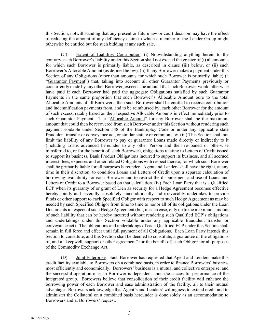 3 163022922_9 this Section, notwithstanding that any present or future law or court decision may have the effect of reducing the amount of any deficiency claim to which a member of the Lender Group might otherwise be entitled but for such bidding at any such sale. (C) Extent of Liability; Contribution. (i) Notwithstanding anything herein to the contrary, each Borrower’s liability under this Section shall not exceed the greater of (i) all amounts for which such Borrower is primarily liable, as described in clause (iii) below, or (ii) such Borrower’s Allocable Amount (as defined below). (ii) If any Borrower makes a payment under this Section of any Obligations (other than amounts for which such Borrower is primarily liable) (a “Guarantor Payment”) that, taking into account all other Guarantor Payments previously or concurrently made by any other Borrower, exceeds the amount that such Borrower would otherwise have paid if each Borrower had paid the aggregate Obligations satisfied by such Guarantor Payments in the same proportion that such Borrower’s Allocable Amount bore to the total Allocable Amounts of all Borrowers, then such Borrower shall be entitled to receive contribution and indemnification payments from, and to be reimbursed by, each other Borrower for the amount of such excess, ratably based on their respective Allocable Amounts in effect immediately prior to such Guarantor Payment. The “Allocable Amount” for any Borrower shall be the maximum amount that could then be recovered from such Borrower under this Section without rendering such payment voidable under Section 548 of the Bankruptcy Code or under any applicable state fraudulent transfer or conveyance act, or similar statute or common law. (iii) This Section shall not limit the liability of any Borrower to pay or guarantee Loans made directly or indirectly to it (including Loans advanced hereunder to any other Person and then re-loaned or otherwise transferred to, or for the benefit of, such Borrower), obligations relating to Letters of Credit issued to support its business, Bank Product Obligations incurred to support its business, and all accrued interest, fees, expenses and other related Obligations with respect thereto, for which such Borrower shall be primarily liable for all purposes hereunder. Agent and Lenders shall have the right, at any time in their discretion, to condition Loans and Letters of Credit upon a separate calculation of borrowing availability for each Borrower and to restrict the disbursement and use of Loans and Letters of Credit to a Borrower based on that calculation. (iv) Each Loan Party that is a Qualified ECP when its guaranty of or grant of Lien as security for a Hedge Agreement becomes effective hereby jointly and severally, absolutely, unconditionally and irrevocably undertakes to provide funds or other support to each Specified Obligor with respect to such Hedge Agreement as may be needed by such Specified Obligor from time to time to honor all of its obligations under the Loan Documents in respect of such Hedge Agreement (but, in each case, only up to the maximum amount of such liability that can be hereby incurred without rendering such Qualified ECP’s obligations and undertakings under this Section voidable under any applicable fraudulent transfer or conveyance act). The obligations and undertakings of each Qualified ECP under this Section shall remain in full force and effect until full payment of all Obligations. Each Loan Party intends this Section to constitute, and this Section shall be deemed to constitute, a guarantee of the obligations of, and a “keepwell, support or other agreement” for the benefit of, each Obligor for all purposes of the Commodity Exchange Act. (D) Joint Enterprise. Each Borrower has requested that Agent and Lenders make this credit facility available to Borrowers on a combined basis, in order to finance Borrowers’ business most efficiently and economically. Borrowers’ business is a mutual and collective enterprise, and the successful operation of each Borrower is dependent upon the successful performance of the integrated group. Borrowers believe that consolidation of their credit facility will enhance the borrowing power of each Borrower and ease administration of the facility, all to their mutual advantage. Borrowers acknowledge that Agent’s and Lenders’ willingness to extend credit and to administer the Collateral on a combined basis hereunder is done solely as an accommodation to Borrowers and at Borrowers’ request.
