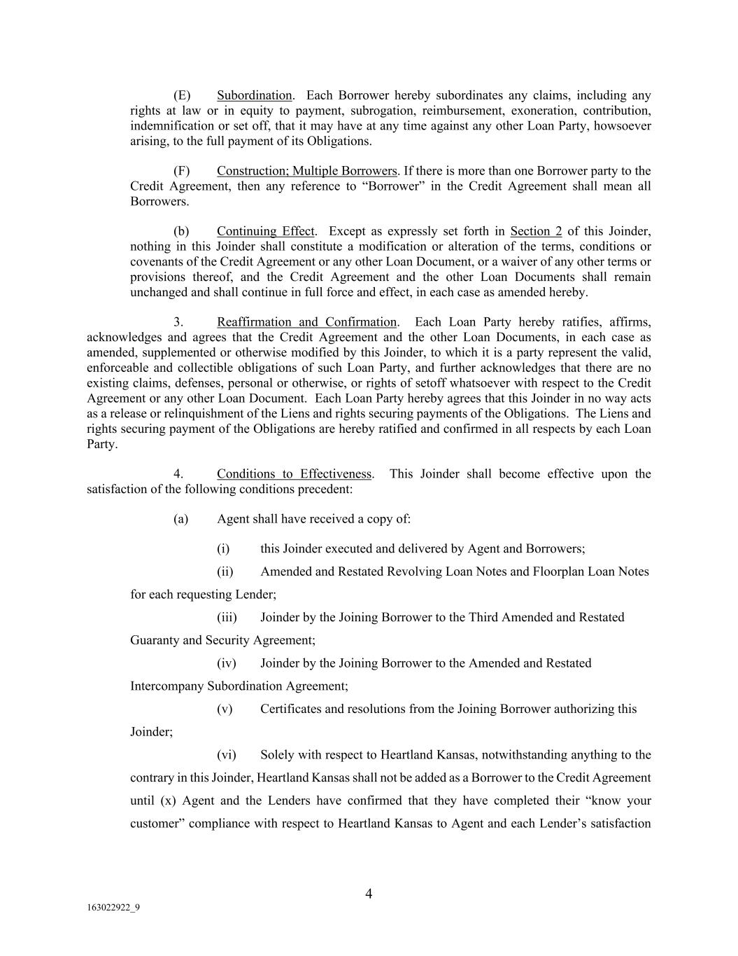 4 163022922_9 (E) Subordination. Each Borrower hereby subordinates any claims, including any rights at law or in equity to payment, subrogation, reimbursement, exoneration, contribution, indemnification or set off, that it may have at any time against any other Loan Party, howsoever arising, to the full payment of its Obligations. (F) Construction; Multiple Borrowers. If there is more than one Borrower party to the Credit Agreement, then any reference to “Borrower” in the Credit Agreement shall mean all Borrowers. (b) Continuing Effect. Except as expressly set forth in Section 2 of this Joinder, nothing in this Joinder shall constitute a modification or alteration of the terms, conditions or covenants of the Credit Agreement or any other Loan Document, or a waiver of any other terms or provisions thereof, and the Credit Agreement and the other Loan Documents shall remain unchanged and shall continue in full force and effect, in each case as amended hereby. 3. Reaffirmation and Confirmation. Each Loan Party hereby ratifies, affirms, acknowledges and agrees that the Credit Agreement and the other Loan Documents, in each case as amended, supplemented or otherwise modified by this Joinder, to which it is a party represent the valid, enforceable and collectible obligations of such Loan Party, and further acknowledges that there are no existing claims, defenses, personal or otherwise, or rights of setoff whatsoever with respect to the Credit Agreement or any other Loan Document. Each Loan Party hereby agrees that this Joinder in no way acts as a release or relinquishment of the Liens and rights securing payments of the Obligations. The Liens and rights securing payment of the Obligations are hereby ratified and confirmed in all respects by each Loan Party. 4. Conditions to Effectiveness. This Joinder shall become effective upon the satisfaction of the following conditions precedent: (a) Agent shall have received a copy of: (i) this Joinder executed and delivered by Agent and Borrowers; (ii) Amended and Restated Revolving Loan Notes and Floorplan Loan Notes for each requesting Lender; (iii) Joinder by the Joining Borrower to the Third Amended and Restated Guaranty and Security Agreement; (iv) Joinder by the Joining Borrower to the Amended and Restated Intercompany Subordination Agreement; (v) Certificates and resolutions from the Joining Borrower authorizing this Joinder; (vi) Solely with respect to Heartland Kansas, notwithstanding anything to the contrary in this Joinder, Heartland Kansas shall not be added as a Borrower to the Credit Agreement until (x) Agent and the Lenders have confirmed that they have completed their “know your customer” compliance with respect to Heartland Kansas to Agent and each Lender’s satisfaction