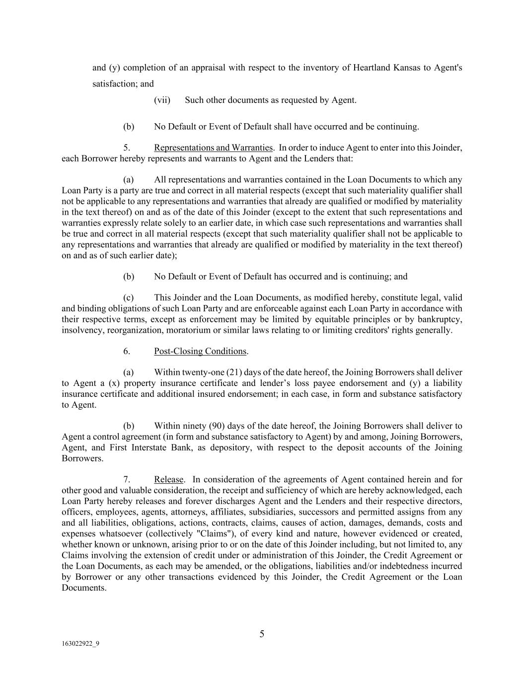 5 163022922_9 and (y) completion of an appraisal with respect to the inventory of Heartland Kansas to Agent's satisfaction; and (vii) Such other documents as requested by Agent. (b) No Default or Event of Default shall have occurred and be continuing. 5. Representations and Warranties. In order to induce Agent to enter into this Joinder, each Borrower hereby represents and warrants to Agent and the Lenders that: (a) All representations and warranties contained in the Loan Documents to which any Loan Party is a party are true and correct in all material respects (except that such materiality qualifier shall not be applicable to any representations and warranties that already are qualified or modified by materiality in the text thereof) on and as of the date of this Joinder (except to the extent that such representations and warranties expressly relate solely to an earlier date, in which case such representations and warranties shall be true and correct in all material respects (except that such materiality qualifier shall not be applicable to any representations and warranties that already are qualified or modified by materiality in the text thereof) on and as of such earlier date); (b) No Default or Event of Default has occurred and is continuing; and (c) This Joinder and the Loan Documents, as modified hereby, constitute legal, valid and binding obligations of such Loan Party and are enforceable against each Loan Party in accordance with their respective terms, except as enforcement may be limited by equitable principles or by bankruptcy, insolvency, reorganization, moratorium or similar laws relating to or limiting creditors' rights generally. 6. Post-Closing Conditions. (a) Within twenty-one (21) days of the date hereof, the Joining Borrowers shall deliver to Agent a (x) property insurance certificate and lender’s loss payee endorsement and (y) a liability insurance certificate and additional insured endorsement; in each case, in form and substance satisfactory to Agent. (b) Within ninety (90) days of the date hereof, the Joining Borrowers shall deliver to Agent a control agreement (in form and substance satisfactory to Agent) by and among, Joining Borrowers, Agent, and First Interstate Bank, as depository, with respect to the deposit accounts of the Joining Borrowers. 7. Release. In consideration of the agreements of Agent contained herein and for other good and valuable consideration, the receipt and sufficiency of which are hereby acknowledged, each Loan Party hereby releases and forever discharges Agent and the Lenders and their respective directors, officers, employees, agents, attorneys, affiliates, subsidiaries, successors and permitted assigns from any and all liabilities, obligations, actions, contracts, claims, causes of action, damages, demands, costs and expenses whatsoever (collectively "Claims"), of every kind and nature, however evidenced or created, whether known or unknown, arising prior to or on the date of this Joinder including, but not limited to, any Claims involving the extension of credit under or administration of this Joinder, the Credit Agreement or the Loan Documents, as each may be amended, or the obligations, liabilities and/or indebtedness incurred by Borrower or any other transactions evidenced by this Joinder, the Credit Agreement or the Loan Documents.