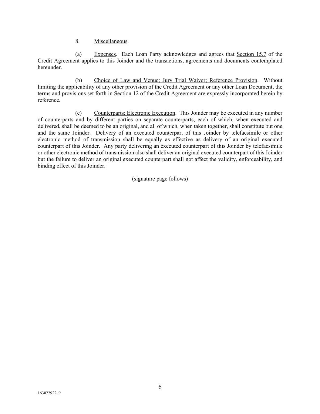 6 163022922_9 8. Miscellaneous. (a) Expenses. Each Loan Party acknowledges and agrees that Section 15.7 of the Credit Agreement applies to this Joinder and the transactions, agreements and documents contemplated hereunder. (b) Choice of Law and Venue; Jury Trial Waiver; Reference Provision. Without limiting the applicability of any other provision of the Credit Agreement or any other Loan Document, the terms and provisions set forth in Section 12 of the Credit Agreement are expressly incorporated herein by reference. (c) Counterparts; Electronic Execution. This Joinder may be executed in any number of counterparts and by different parties on separate counterparts, each of which, when executed and delivered, shall be deemed to be an original, and all of which, when taken together, shall constitute but one and the same Joinder. Delivery of an executed counterpart of this Joinder by telefacsimile or other electronic method of transmission shall be equally as effective as delivery of an original executed counterpart of this Joinder. Any party delivering an executed counterpart of this Joinder by telefacsimile or other electronic method of transmission also shall deliver an original executed counterpart of this Joinder but the failure to deliver an original executed counterpart shall not affect the validity, enforceability, and binding effect of this Joinder. (signature page follows)