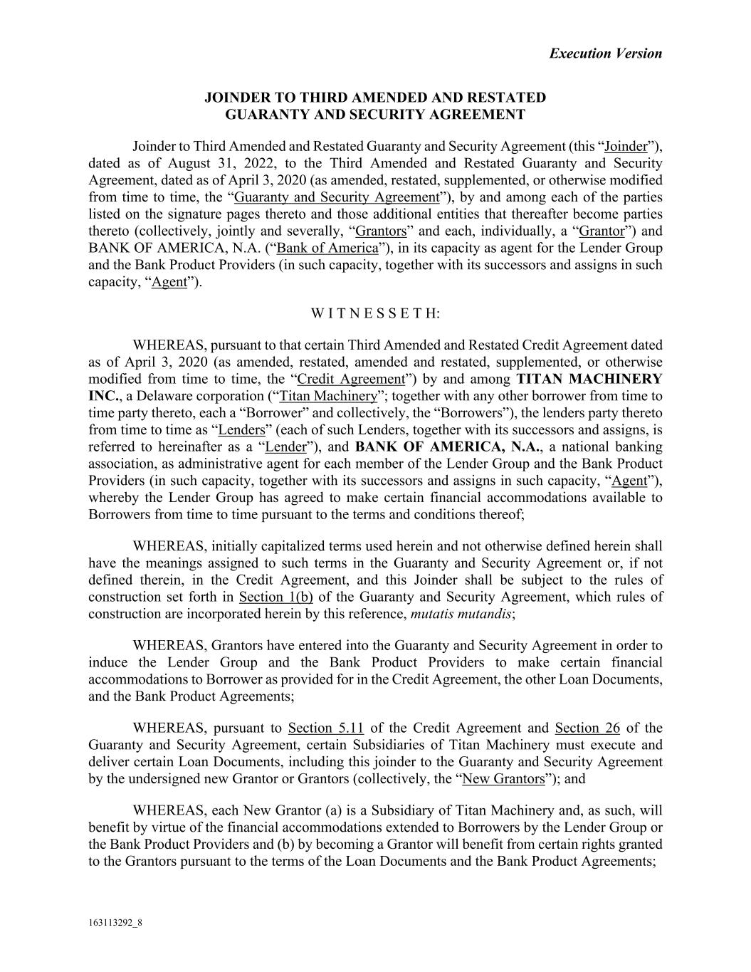 Execution Version 163113292_8 JOINDER TO THIRD AMENDED AND RESTATED GUARANTY AND SECURITY AGREEMENT Joinder to Third Amended and Restated Guaranty and Security Agreement (this “Joinder”), dated as of August 31, 2022, to the Third Amended and Restated Guaranty and Security Agreement, dated as of April 3, 2020 (as amended, restated, supplemented, or otherwise modified from time to time, the “Guaranty and Security Agreement”), by and among each of the parties listed on the signature pages thereto and those additional entities that thereafter become parties thereto (collectively, jointly and severally, “Grantors” and each, individually, a “Grantor”) and BANK OF AMERICA, N.A. (“Bank of America”), in its capacity as agent for the Lender Group and the Bank Product Providers (in such capacity, together with its successors and assigns in such capacity, “Agent”). W I T N E S S E T H: WHEREAS, pursuant to that certain Third Amended and Restated Credit Agreement dated as of April 3, 2020 (as amended, restated, amended and restated, supplemented, or otherwise modified from time to time, the “Credit Agreement”) by and among TITAN MACHINERY INC., a Delaware corporation (“Titan Machinery”; together with any other borrower from time to time party thereto, each a “Borrower” and collectively, the “Borrowers”), the lenders party thereto from time to time as “Lenders” (each of such Lenders, together with its successors and assigns, is referred to hereinafter as a “Lender”), and BANK OF AMERICA, N.A., a national banking association, as administrative agent for each member of the Lender Group and the Bank Product Providers (in such capacity, together with its successors and assigns in such capacity, “Agent”), whereby the Lender Group has agreed to make certain financial accommodations available to Borrowers from time to time pursuant to the terms and conditions thereof; WHEREAS, initially capitalized terms used herein and not otherwise defined herein shall have the meanings assigned to such terms in the Guaranty and Security Agreement or, if not defined therein, in the Credit Agreement, and this Joinder shall be subject to the rules of construction set forth in Section 1(b) of the Guaranty and Security Agreement, which rules of construction are incorporated herein by this reference, mutatis mutandis; WHEREAS, Grantors have entered into the Guaranty and Security Agreement in order to induce the Lender Group and the Bank Product Providers to make certain financial accommodations to Borrower as provided for in the Credit Agreement, the other Loan Documents, and the Bank Product Agreements; WHEREAS, pursuant to Section 5.11 of the Credit Agreement and Section 26 of the Guaranty and Security Agreement, certain Subsidiaries of Titan Machinery must execute and deliver certain Loan Documents, including this joinder to the Guaranty and Security Agreement by the undersigned new Grantor or Grantors (collectively, the “New Grantors”); and WHEREAS, each New Grantor (a) is a Subsidiary of Titan Machinery and, as such, will benefit by virtue of the financial accommodations extended to Borrowers by the Lender Group or the Bank Product Providers and (b) by becoming a Grantor will benefit from certain rights granted to the Grantors pursuant to the terms of the Loan Documents and the Bank Product Agreements;