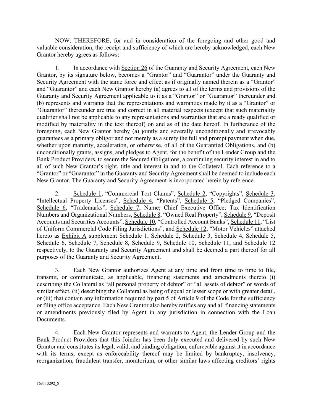 163113292_8 NOW, THEREFORE, for and in consideration of the foregoing and other good and valuable consideration, the receipt and sufficiency of which are hereby acknowledged, each New Grantor hereby agrees as follows: 1. In accordance with Section 26 of the Guaranty and Security Agreement, each New Grantor, by its signature below, becomes a “Grantor” and “Guarantor” under the Guaranty and Security Agreement with the same force and effect as if originally named therein as a “Grantor” and “Guarantor” and each New Grantor hereby (a) agrees to all of the terms and provisions of the Guaranty and Security Agreement applicable to it as a “Grantor” or “Guarantor” thereunder and (b) represents and warrants that the representations and warranties made by it as a “Grantor” or “Guarantor” thereunder are true and correct in all material respects (except that such materiality qualifier shall not be applicable to any representations and warranties that are already qualified or modified by materiality in the text thereof) on and as of the date hereof. In furtherance of the foregoing, each New Grantor hereby (a) jointly and severally unconditionally and irrevocably guarantees as a primary obligor and not merely as a surety the full and prompt payment when due, whether upon maturity, acceleration, or otherwise, of all of the Guarantied Obligations, and (b) unconditionally grants, assigns, and pledges to Agent, for the benefit of the Lender Group and the Bank Product Providers, to secure the Secured Obligations, a continuing security interest in and to all of such New Grantor’s right, title and interest in and to the Collateral. Each reference to a “Grantor” or “Guarantor” in the Guaranty and Security Agreement shall be deemed to include each New Grantor. The Guaranty and Security Agreement is incorporated herein by reference. 2. Schedule 1, “Commercial Tort Claims”, Schedule 2, “Copyrights”, Schedule 3, “Intellectual Property Licenses”, Schedule 4, “Patents”, Schedule 5, “Pledged Companies”, Schedule 6, “Trademarks”, Schedule 7, Name; Chief Executive Office; Tax Identification Numbers and Organizational Numbers, Schedule 8, “Owned Real Property”, Schedule 9, “Deposit Accounts and Securities Accounts”, Schedule 10, “Controlled Account Banks”, Schedule 11, “List of Uniform Commercial Code Filing Jurisdictions”, and Schedule 12, “Motor Vehicles” attached hereto as Exhibit A supplement Schedule 1, Schedule 2, Schedule 3, Schedule 4, Schedule 5, Schedule 6, Schedule 7, Schedule 8, Schedule 9, Schedule 10, Schedule 11, and Schedule 12 respectively, to the Guaranty and Security Agreement and shall be deemed a part thereof for all purposes of the Guaranty and Security Agreement. 3. Each New Grantor authorizes Agent at any time and from time to time to file, transmit, or communicate, as applicable, financing statements and amendments thereto (i) describing the Collateral as “all personal property of debtor” or “all assets of debtor” or words of similar effect, (ii) describing the Collateral as being of equal or lesser scope or with greater detail, or (iii) that contain any information required by part 5 of Article 9 of the Code for the sufficiency or filing office acceptance. Each New Grantor also hereby ratifies any and all financing statements or amendments previously filed by Agent in any jurisdiction in connection with the Loan Documents. 4. Each New Grantor represents and warrants to Agent, the Lender Group and the Bank Product Providers that this Joinder has been duly executed and delivered by such New Grantor and constitutes its legal, valid, and binding obligation, enforceable against it in accordance with its terms, except as enforceability thereof may be limited by bankruptcy, insolvency, reorganization, fraudulent transfer, moratorium, or other similar laws affecting creditors’ rights