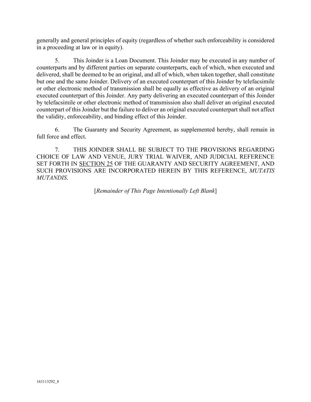 163113292_8 generally and general principles of equity (regardless of whether such enforceability is considered in a proceeding at law or in equity). 5. This Joinder is a Loan Document. This Joinder may be executed in any number of counterparts and by different parties on separate counterparts, each of which, when executed and delivered, shall be deemed to be an original, and all of which, when taken together, shall constitute but one and the same Joinder. Delivery of an executed counterpart of this Joinder by telefacsimile or other electronic method of transmission shall be equally as effective as delivery of an original executed counterpart of this Joinder. Any party delivering an executed counterpart of this Joinder by telefacsimile or other electronic method of transmission also shall deliver an original executed counterpart of this Joinder but the failure to deliver an original executed counterpart shall not affect the validity, enforceability, and binding effect of this Joinder. 6. The Guaranty and Security Agreement, as supplemented hereby, shall remain in full force and effect. 7. THIS JOINDER SHALL BE SUBJECT TO THE PROVISIONS REGARDING CHOICE OF LAW AND VENUE, JURY TRIAL WAIVER, AND JUDICIAL REFERENCE SET FORTH IN SECTION 25 OF THE GUARANTY AND SECURITY AGREEMENT, AND SUCH PROVISIONS ARE INCORPORATED HEREIN BY THIS REFERENCE, MUTATIS MUTANDIS. [Remainder of This Page Intentionally Left Blank]