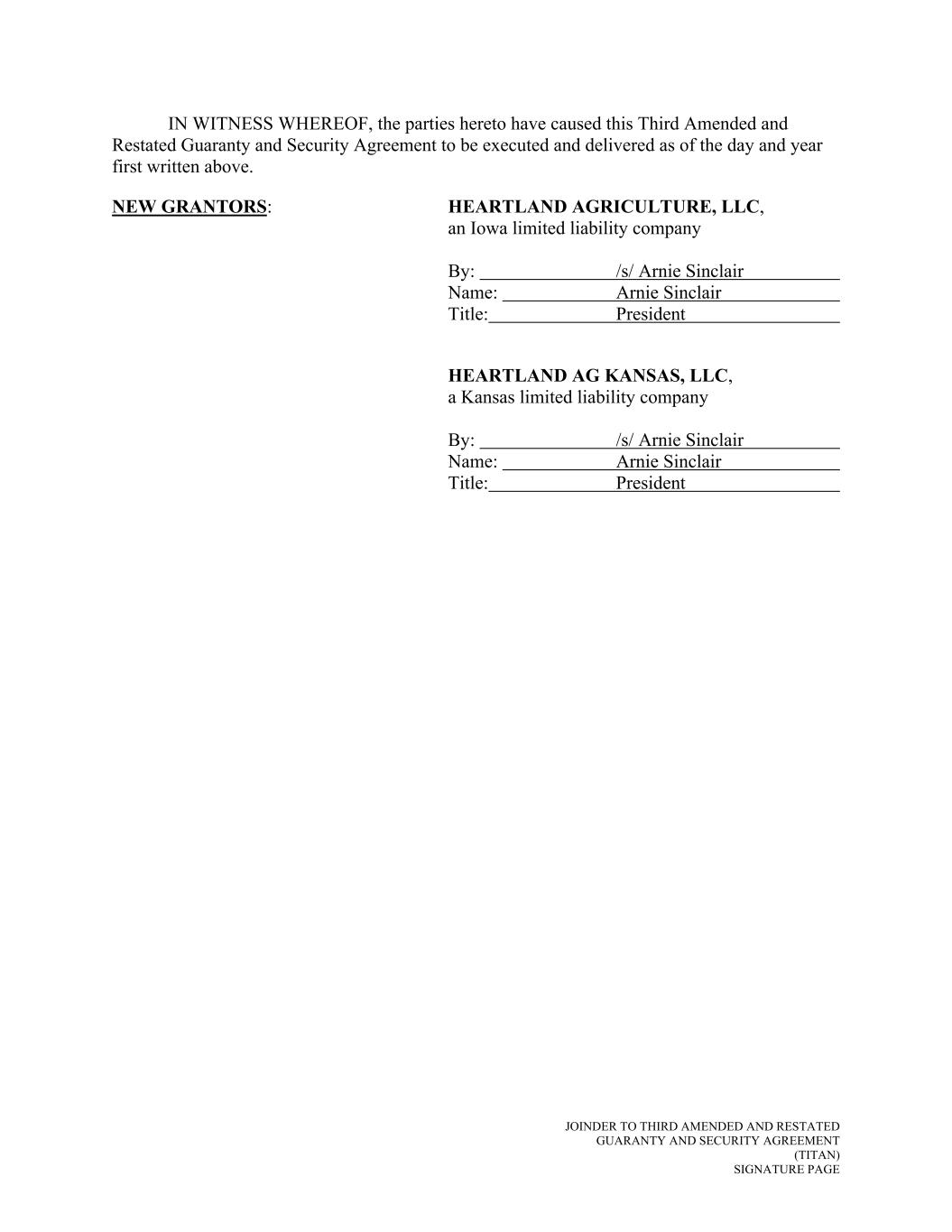 JOINDER TO THIRD AMENDED AND RESTATED GUARANTY AND SECURITY AGREEMENT (TITAN) SIGNATURE PAGE IN WITNESS WHEREOF, the parties hereto have caused this Third Amended and Restated Guaranty and Security Agreement to be executed and delivered as of the day and year first written above. NEW GRANTORS: HEARTLAND AGRICULTURE, LLC, an Iowa limited liability company By: /s/ Arnie Sinclair Name: Arnie Sinclair Title: President HEARTLAND AG KANSAS, LLC, a Kansas limited liability company By: /s/ Arnie Sinclair Name: Arnie Sinclair Title: President