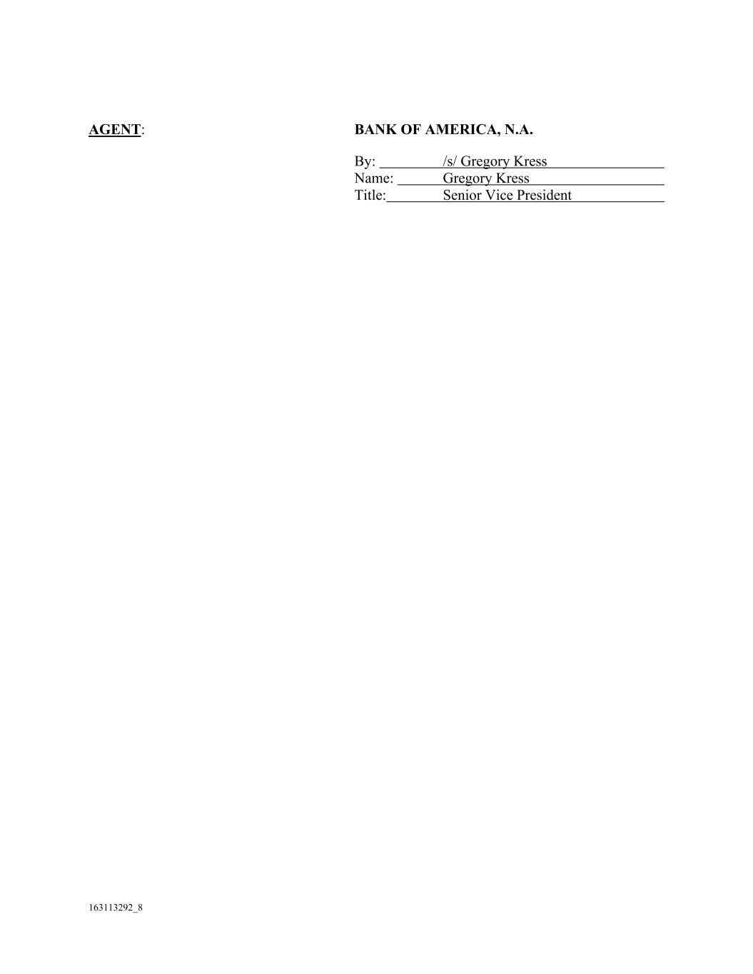 163113292_8 AGENT: BANK OF AMERICA, N.A. By: /s/ Gregory Kress Name: Gregory Kress Title: Senior Vice President