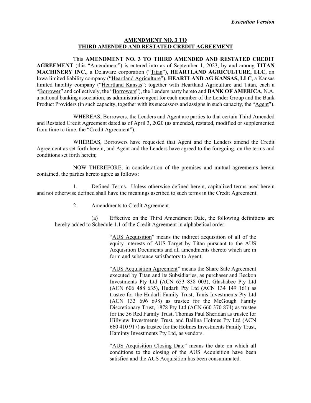 Execution Version AMENDMENT NO. 3 TO THIRD AMENDED AND RESTATED CREDIT AGREEMENT This AMENDMENT NO. 3 TO THIRD AMENDED AND RESTATED CREDIT AGREEMENT (this “Amendment”) is entered into as of September 1, 2023, by and among TITAN MACHINERY INC., a Delaware corporation (“Titan”), HEARTLAND AGRICULTURE, LLC, an Iowa limited liability company (“Heartland Agriculture”), HEARTLAND AG KANSAS, LLC, a Kansas limited liability company (“Heartland Kansas”; together with Heartland Agriculture and Titan, each a “Borrower” and collectively, the “Borrowers”), the Lenders party hereto and BANK OF AMERICA, N.A. a national banking association, as administrative agent for each member of the Lender Group and the Bank Product Providers (in such capacity, together with its successors and assigns in such capacity, the “Agent”). WHEREAS, Borrowers, the Lenders and Agent are parties to that certain Third Amended and Restated Credit Agreement dated as of April 3, 2020 (as amended, restated, modified or supplemented from time to time, the “Credit Agreement”); WHEREAS, Borrowers have requested that Agent and the Lenders amend the Credit Agreement as set forth herein, and Agent and the Lenders have agreed to the foregoing, on the terms and conditions set forth herein; NOW THEREFORE, in consideration of the premises and mutual agreements herein contained, the parties hereto agree as follows: 1. Defined Terms. Unless otherwise defined herein, capitalized terms used herein and not otherwise defined shall have the meanings ascribed to such terms in the Credit Agreement. 2. Amendments to Credit Agreement. (a) Effective on the Third Amendment Date, the following definitions are hereby added to Schedule 1.1 of the Credit Agreement in alphabetical order: “AUS Acquisition” means the indirect acquisition of all of the equity interests of AUS Target by Titan pursuant to the AUS Acquisition Documents and all amendments thereto which are in form and substance satisfactory to Agent. “AUS Acquisition Agreement” means the Share Sale Agreement executed by Titan and its Subsidiaries, as purchaser and Beckon Investments Pty Ltd (ACN 653 838 003), Glashabee Pty Ltd (ACN 606 488 635), Hudarli Pty Ltd (ACN 134 149 161) as trustee for the Hudarli Family Trust, Tanis Investments Pty Ltd (ACN 133 696 698) as trustee for the McGough Family Discretionary Trust, 1878 Pty Ltd (ACN 660 370 874) as trustee for the 36 Red Family Trust, Thomas Paul Sheridan as trustee for Hillview Investments Trust, and Ballina Holmes Pty Ltd (ACN 660 410 917) as trustee for the Holmes Investments Family Trust, Haminty Investments Pty Ltd, as vendors. “AUS Acquisition Closing Date” means the date on which all conditions to the closing of the AUS Acquisition have been satisfied and the AUS Acquisition has been consummated.