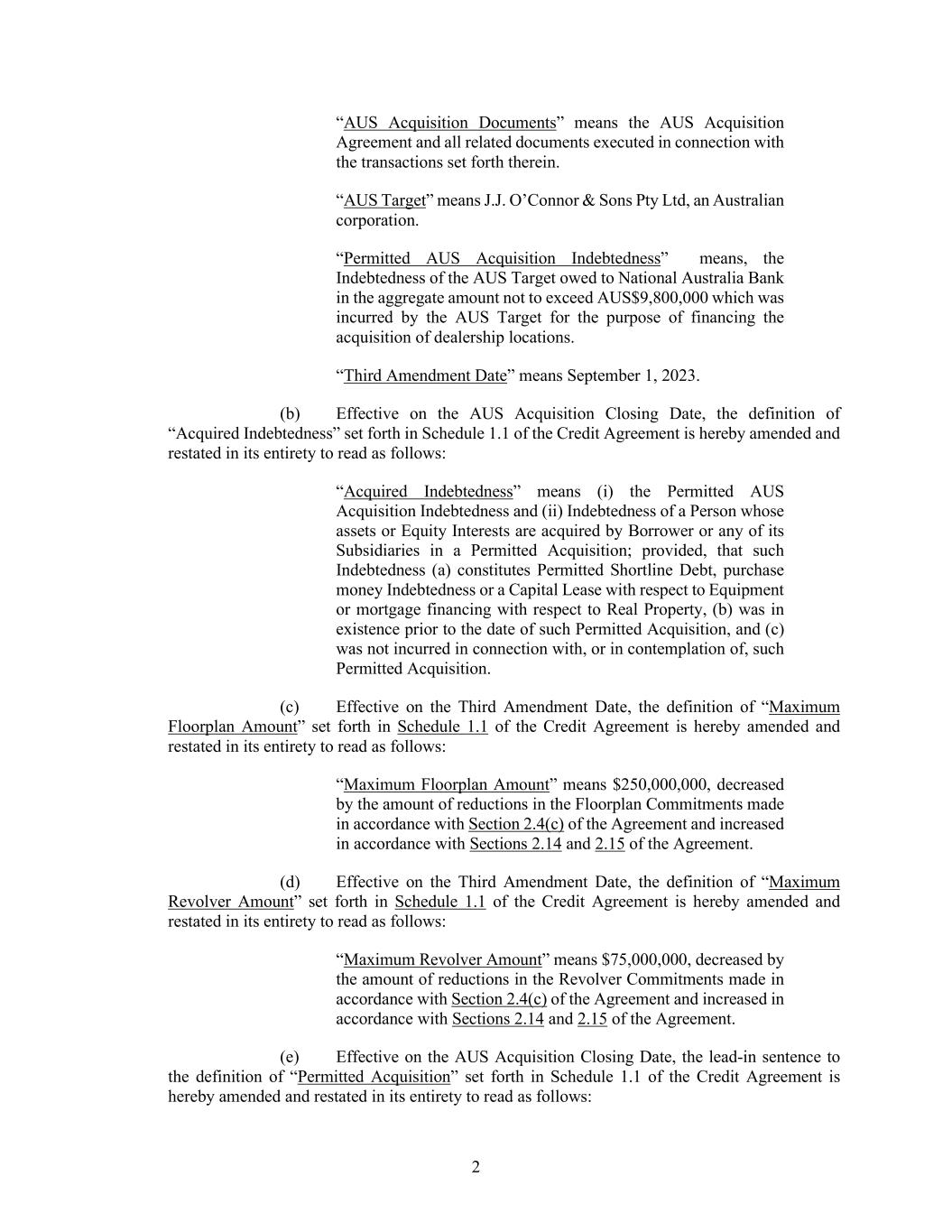 2 “AUS Acquisition Documents” means the AUS Acquisition Agreement and all related documents executed in connection with the transactions set forth therein. “AUS Target” means J.J. O’Connor & Sons Pty Ltd, an Australian corporation. “Permitted AUS Acquisition Indebtedness” means, the Indebtedness of the AUS Target owed to National Australia Bank in the aggregate amount not to exceed AUS$9,800,000 which was incurred by the AUS Target for the purpose of financing the acquisition of dealership locations. “Third Amendment Date” means September 1, 2023. (b) Effective on the AUS Acquisition Closing Date, the definition of “Acquired Indebtedness” set forth in Schedule 1.1 of the Credit Agreement is hereby amended and restated in its entirety to read as follows: “Acquired Indebtedness” means (i) the Permitted AUS Acquisition Indebtedness and (ii) Indebtedness of a Person whose assets or Equity Interests are acquired by Borrower or any of its Subsidiaries in a Permitted Acquisition; provided, that such Indebtedness (a) constitutes Permitted Shortline Debt, purchase money Indebtedness or a Capital Lease with respect to Equipment or mortgage financing with respect to Real Property, (b) was in existence prior to the date of such Permitted Acquisition, and (c) was not incurred in connection with, or in contemplation of, such Permitted Acquisition. (c) Effective on the Third Amendment Date, the definition of “Maximum Floorplan Amount” set forth in Schedule 1.1 of the Credit Agreement is hereby amended and restated in its entirety to read as follows: “Maximum Floorplan Amount” means $250,000,000, decreased by the amount of reductions in the Floorplan Commitments made in accordance with Section 2.4(c) of the Agreement and increased in accordance with Sections 2.14 and 2.15 of the Agreement. (d) Effective on the Third Amendment Date, the definition of “Maximum Revolver Amount” set forth in Schedule 1.1 of the Credit Agreement is hereby amended and restated in its entirety to read as follows: “Maximum Revolver Amount” means $75,000,000, decreased by the amount of reductions in the Revolver Commitments made in accordance with Section 2.4(c) of the Agreement and increased in accordance with Sections 2.14 and 2.15 of the Agreement. (e) Effective on the AUS Acquisition Closing Date, the lead-in sentence to the definition of “Permitted Acquisition” set forth in Schedule 1.1 of the Credit Agreement is hereby amended and restated in its entirety to read as follows: