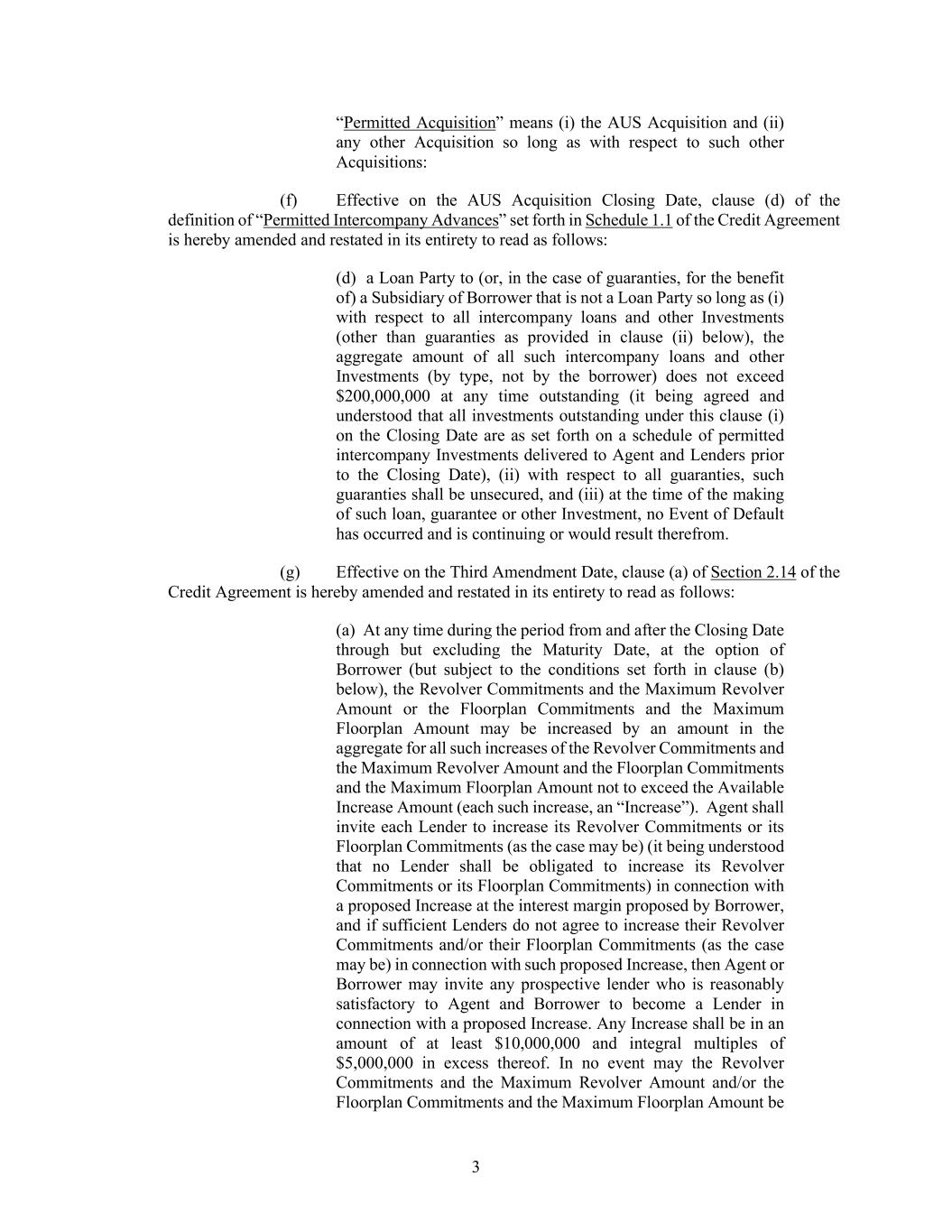 3 “Permitted Acquisition” means (i) the AUS Acquisition and (ii) any other Acquisition so long as with respect to such other Acquisitions: (f) Effective on the AUS Acquisition Closing Date, clause (d) of the definition of “Permitted Intercompany Advances” set forth in Schedule 1.1 of the Credit Agreement is hereby amended and restated in its entirety to read as follows: (d) a Loan Party to (or, in the case of guaranties, for the benefit of) a Subsidiary of Borrower that is not a Loan Party so long as (i) with respect to all intercompany loans and other Investments (other than guaranties as provided in clause (ii) below), the aggregate amount of all such intercompany loans and other Investments (by type, not by the borrower) does not exceed $200,000,000 at any time outstanding (it being agreed and understood that all investments outstanding under this clause (i) on the Closing Date are as set forth on a schedule of permitted intercompany Investments delivered to Agent and Lenders prior to the Closing Date), (ii) with respect to all guaranties, such guaranties shall be unsecured, and (iii) at the time of the making of such loan, guarantee or other Investment, no Event of Default has occurred and is continuing or would result therefrom. (g) Effective on the Third Amendment Date, clause (a) of Section 2.14 of the Credit Agreement is hereby amended and restated in its entirety to read as follows: (a) At any time during the period from and after the Closing Date through but excluding the Maturity Date, at the option of Borrower (but subject to the conditions set forth in clause (b) below), the Revolver Commitments and the Maximum Revolver Amount or the Floorplan Commitments and the Maximum Floorplan Amount may be increased by an amount in the aggregate for all such increases of the Revolver Commitments and the Maximum Revolver Amount and the Floorplan Commitments and the Maximum Floorplan Amount not to exceed the Available Increase Amount (each such increase, an “Increase”). Agent shall invite each Lender to increase its Revolver Commitments or its Floorplan Commitments (as the case may be) (it being understood that no Lender shall be obligated to increase its Revolver Commitments or its Floorplan Commitments) in connection with a proposed Increase at the interest margin proposed by Borrower, and if sufficient Lenders do not agree to increase their Revolver Commitments and/or their Floorplan Commitments (as the case may be) in connection with such proposed Increase, then Agent or Borrower may invite any prospective lender who is reasonably satisfactory to Agent and Borrower to become a Lender in connection with a proposed Increase. Any Increase shall be in an amount of at least $10,000,000 and integral multiples of $5,000,000 in excess thereof. In no event may the Revolver Commitments and the Maximum Revolver Amount and/or the Floorplan Commitments and the Maximum Floorplan Amount be