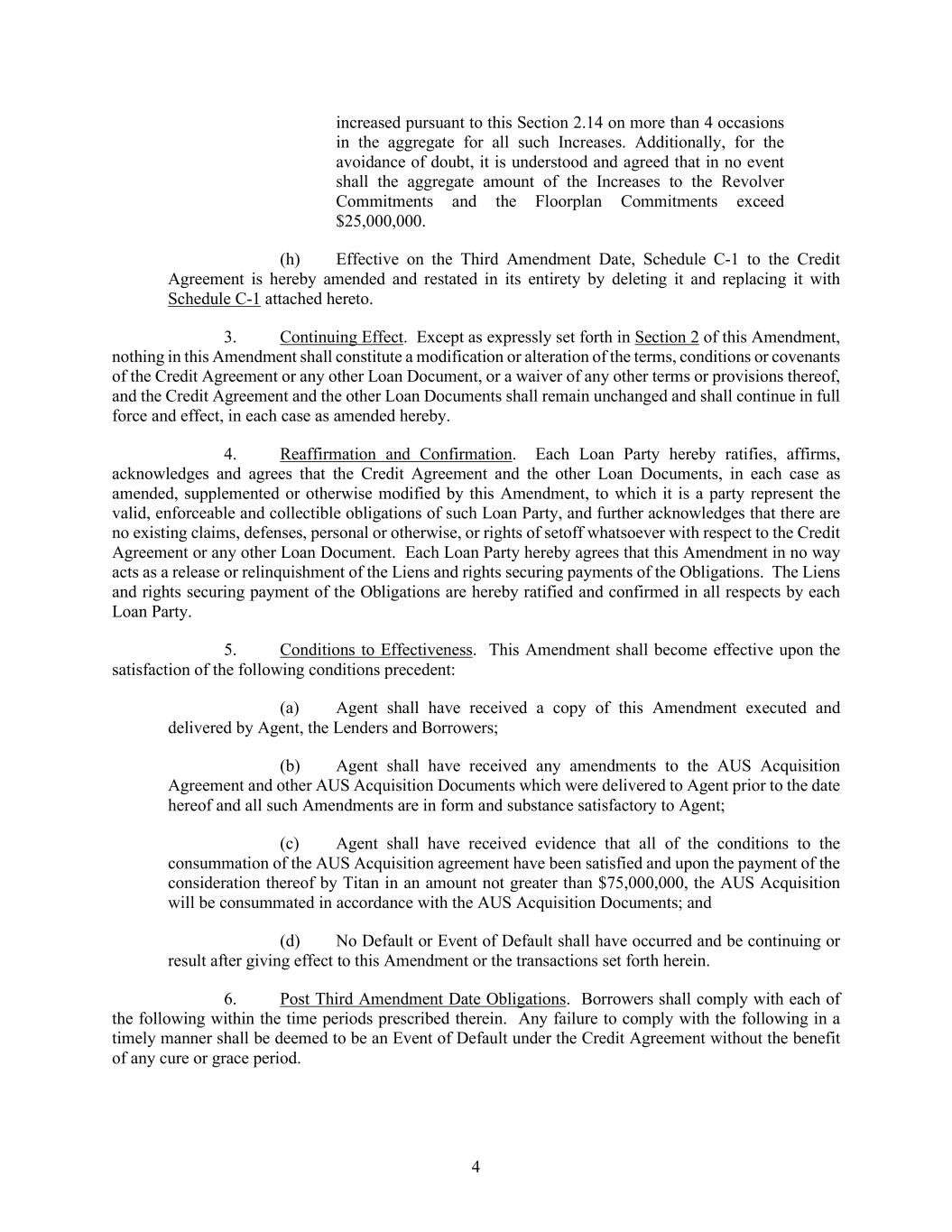 4 increased pursuant to this Section 2.14 on more than 4 occasions in the aggregate for all such Increases. Additionally, for the avoidance of doubt, it is understood and agreed that in no event shall the aggregate amount of the Increases to the Revolver Commitments and the Floorplan Commitments exceed $25,000,000. (h) Effective on the Third Amendment Date, Schedule C-1 to the Credit Agreement is hereby amended and restated in its entirety by deleting it and replacing it with Schedule C-1 attached hereto. 3. Continuing Effect. Except as expressly set forth in Section 2 of this Amendment, nothing in this Amendment shall constitute a modification or alteration of the terms, conditions or covenants of the Credit Agreement or any other Loan Document, or a waiver of any other terms or provisions thereof, and the Credit Agreement and the other Loan Documents shall remain unchanged and shall continue in full force and effect, in each case as amended hereby. 4. Reaffirmation and Confirmation. Each Loan Party hereby ratifies, affirms, acknowledges and agrees that the Credit Agreement and the other Loan Documents, in each case as amended, supplemented or otherwise modified by this Amendment, to which it is a party represent the valid, enforceable and collectible obligations of such Loan Party, and further acknowledges that there are no existing claims, defenses, personal or otherwise, or rights of setoff whatsoever with respect to the Credit Agreement or any other Loan Document. Each Loan Party hereby agrees that this Amendment in no way acts as a release or relinquishment of the Liens and rights securing payments of the Obligations. The Liens and rights securing payment of the Obligations are hereby ratified and confirmed in all respects by each Loan Party. 5. Conditions to Effectiveness. This Amendment shall become effective upon the satisfaction of the following conditions precedent: (a) Agent shall have received a copy of this Amendment executed and delivered by Agent, the Lenders and Borrowers; (b) Agent shall have received any amendments to the AUS Acquisition Agreement and other AUS Acquisition Documents which were delivered to Agent prior to the date hereof and all such Amendments are in form and substance satisfactory to Agent; (c) Agent shall have received evidence that all of the conditions to the consummation of the AUS Acquisition agreement have been satisfied and upon the payment of the consideration thereof by Titan in an amount not greater than $75,000,000, the AUS Acquisition will be consummated in accordance with the AUS Acquisition Documents; and (d) No Default or Event of Default shall have occurred and be continuing or result after giving effect to this Amendment or the transactions set forth herein. 6. Post Third Amendment Date Obligations. Borrowers shall comply with each of the following within the time periods prescribed therein. Any failure to comply with the following in a timely manner shall be deemed to be an Event of Default under the Credit Agreement without the benefit of any cure or grace period.