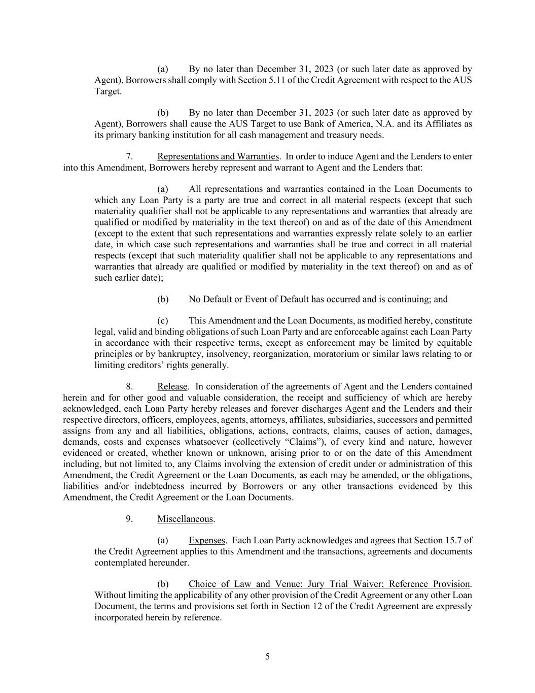 5 (a) By no later than December 31, 2023 (or such later date as approved by Agent), Borrowers shall comply with Section 5.11 of the Credit Agreement with respect to the AUS Target. (b) By no later than December 31, 2023 (or such later date as approved by Agent), Borrowers shall cause the AUS Target to use Bank of America, N.A. and its Affiliates as its primary banking institution for all cash management and treasury needs. 7. Representations and Warranties. In order to induce Agent and the Lenders to enter into this Amendment, Borrowers hereby represent and warrant to Agent and the Lenders that: (a) All representations and warranties contained in the Loan Documents to which any Loan Party is a party are true and correct in all material respects (except that such materiality qualifier shall not be applicable to any representations and warranties that already are qualified or modified by materiality in the text thereof) on and as of the date of this Amendment (except to the extent that such representations and warranties expressly relate solely to an earlier date, in which case such representations and warranties shall be true and correct in all material respects (except that such materiality qualifier shall not be applicable to any representations and warranties that already are qualified or modified by materiality in the text thereof) on and as of such earlier date); (b) No Default or Event of Default has occurred and is continuing; and (c) This Amendment and the Loan Documents, as modified hereby, constitute legal, valid and binding obligations of such Loan Party and are enforceable against each Loan Party in accordance with their respective terms, except as enforcement may be limited by equitable principles or by bankruptcy, insolvency, reorganization, moratorium or similar laws relating to or limiting creditors’ rights generally. 8. Release. In consideration of the agreements of Agent and the Lenders contained herein and for other good and valuable consideration, the receipt and sufficiency of which are hereby acknowledged, each Loan Party hereby releases and forever discharges Agent and the Lenders and their respective directors, officers, employees, agents, attorneys, affiliates, subsidiaries, successors and permitted assigns from any and all liabilities, obligations, actions, contracts, claims, causes of action, damages, demands, costs and expenses whatsoever (collectively “Claims”), of every kind and nature, however evidenced or created, whether known or unknown, arising prior to or on the date of this Amendment including, but not limited to, any Claims involving the extension of credit under or administration of this Amendment, the Credit Agreement or the Loan Documents, as each may be amended, or the obligations, liabilities and/or indebtedness incurred by Borrowers or any other transactions evidenced by this Amendment, the Credit Agreement or the Loan Documents. 9. Miscellaneous. (a) Expenses. Each Loan Party acknowledges and agrees that Section 15.7 of the Credit Agreement applies to this Amendment and the transactions, agreements and documents contemplated hereunder. (b) Choice of Law and Venue; Jury Trial Waiver; Reference Provision. Without limiting the applicability of any other provision of the Credit Agreement or any other Loan Document, the terms and provisions set forth in Section 12 of the Credit Agreement are expressly incorporated herein by reference.
