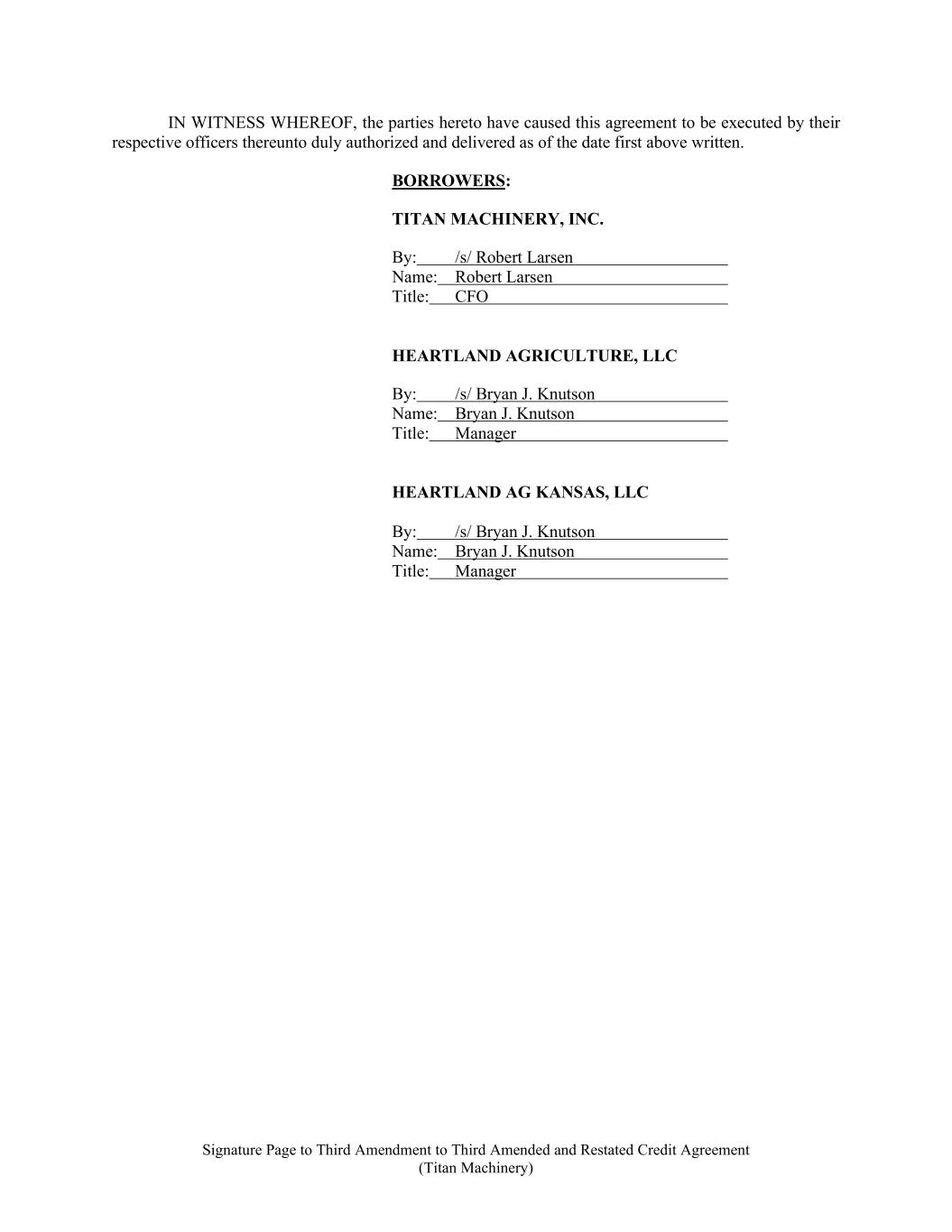 Signature Page to Third Amendment to Third Amended and Restated Credit Agreement (Titan Machinery) IN WITNESS WHEREOF, the parties hereto have caused this agreement to be executed by their respective officers thereunto duly authorized and delivered as of the date first above written. BORROWERS: TITAN MACHINERY, INC. By: /s/ Robert Larsen Name: Robert Larsen Title: CFO HEARTLAND AGRICULTURE, LLC By: /s/ Bryan J. Knutson Name: Bryan J. Knutson Title: Manager HEARTLAND AG KANSAS, LLC By: /s/ Bryan J. Knutson Name: Bryan J. Knutson Title: Manager