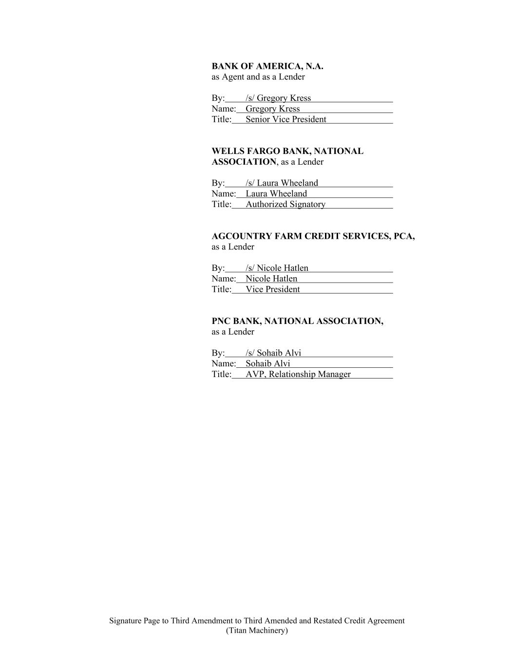 Signature Page to Third Amendment to Third Amended and Restated Credit Agreement (Titan Machinery) BANK OF AMERICA, N.A. as Agent and as a Lender By: /s/ Gregory Kress Name: Gregory Kress Title: Senior Vice President WELLS FARGO BANK, NATIONAL ASSOCIATION, as a Lender By: /s/ Laura Wheeland Name: Laura Wheeland Title: Authorized Signatory AGCOUNTRY FARM CREDIT SERVICES, PCA, as a Lender By: /s/ Nicole Hatlen Name: Nicole Hatlen Title: Vice President PNC BANK, NATIONAL ASSOCIATION, as a Lender By: /s/ Sohaib Alvi Name: Sohaib Alvi Title: AVP, Relationship Manager