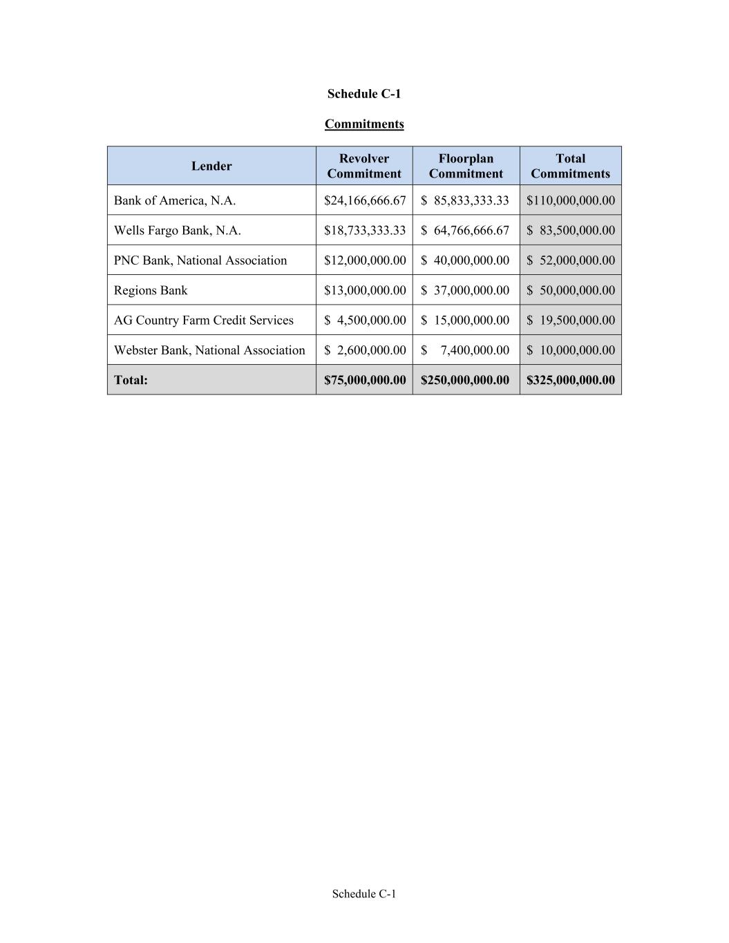 Schedule C-1 Schedule C-1 Commitments Lender Revolver Commitment Floorplan Commitment Total Commitments Bank of America, N.A. $24,166,666.67 $ 85,833,333.33 $110,000,000.00 Wells Fargo Bank, N.A. $18,733,333.33 $ 64,766,666.67 $ 83,500,000.00 PNC Bank, National Association $12,000,000.00 $ 40,000,000.00 $ 52,000,000.00 Regions Bank $13,000,000.00 $ 37,000,000.00 $ 50,000,000.00 AG Country Farm Credit Services $ 4,500,000.00 $ 15,000,000.00 $ 19,500,000.00 Webster Bank, National Association $ 2,600,000.00 $ 7,400,000.00 $ 10,000,000.00 Total: $75,000,000.00 $250,000,000.00 $325,000,000.00