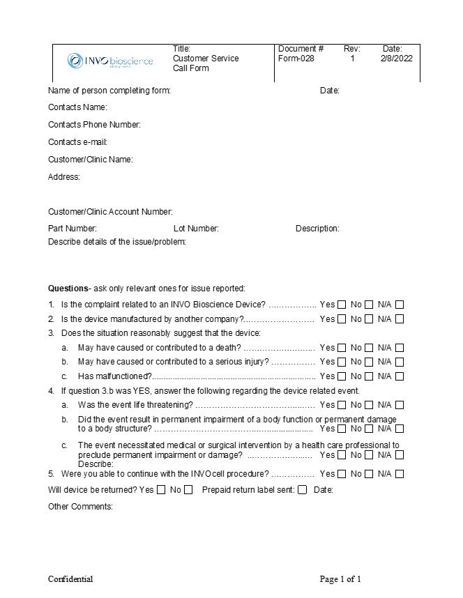 3.DISTRIBUTOR shall immediately report to INVO all matters of vigilance in writing, including complaints or reports of suspected incidents related to Products that DISTRIBUTOR has placed on the market. INVO will inform any relevant authority of such matters. DISTRIBUTOR shall provide INVO the information required on Form-028, attached hereto as Exhibit H regarding the alleged product issue.