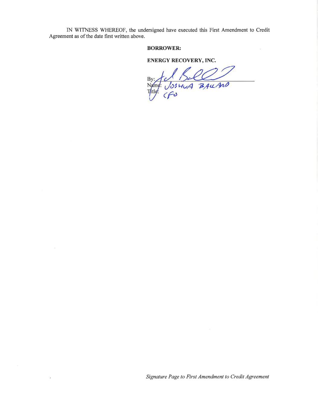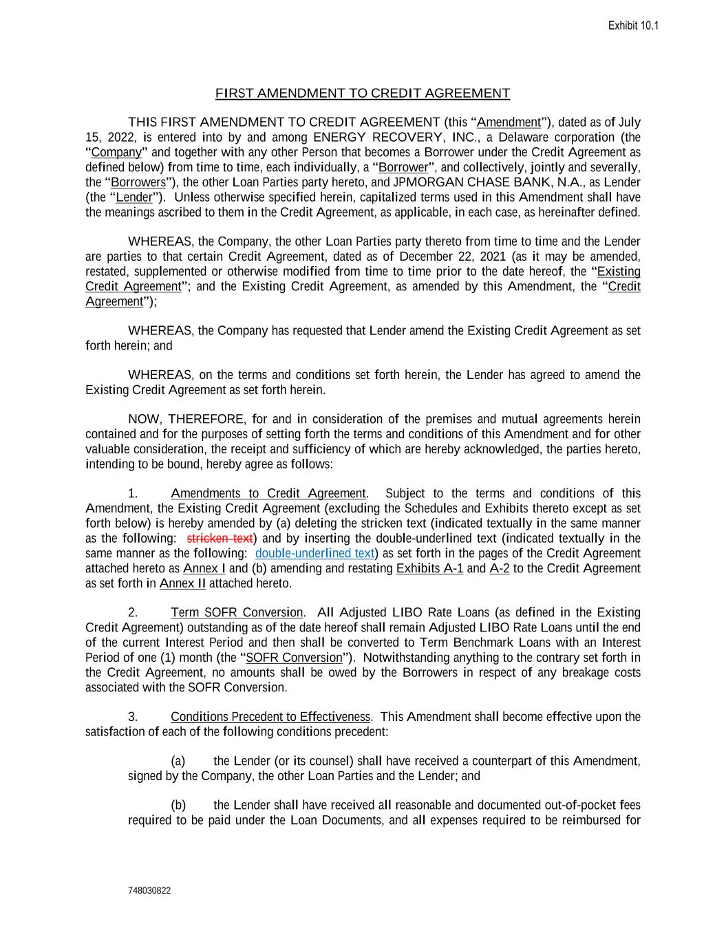 748030822 FIRST AMENDMENT TO CREDIT AGREEMENT THIS FIRST AMENDMENT TO CREDIT AGREEMENT (this “Amendment”), dated as of July 15, 2022, is entered into by and among ENERGY RECOVERY, INC., a Delaware corporation (the “Company” and together with any other Person that becomes a Borrower under the Credit Agreement as defined below) from time to time, each individually, a “Borrower”, and collectively, jointly and severally, the “Borrowers”), the other Loan Parties party hereto, and JPMORGAN CHASE BANK, N.A., as Lender (the “Lender”). Unless otherwise specified herein, capitalized terms used in this Amendment shall have the meanings ascribed to them in the Credit Agreement, as applicable, in each case, as hereinafter defined. WHEREAS, the Company, the other Loan Parties party thereto from time to time and the Lender are parties to that certain Credit Agreement, dated as of December 22, 2021 (as it may be amended, restated, supplemented or otherwise modified from time to time prior to the date hereof, the “Existing Credit Agreement”; and the Existing Credit Agreement, as amended by this Amendment, the “Credit Agreement”); WHEREAS, the Company has requested that Lender amend the Existing Credit Agreement as set forth herein; and WHEREAS, on the terms and conditions set forth herein, the Lender has agreed to amend the Existing Credit Agreement as set forth herein. NOW, THEREFORE, for and in consideration of the premises and mutual agreements herein contained and for the purposes of setting forth the terms and conditions of this Amendment and for other valuable consideration, the receipt and sufficiency of which are hereby acknowledged, the parties hereto, intending to be bound, hereby agree as follows: 1. Amendments to Credit Agreement. Subject to the terms and conditions of this Amendment, the Existing Credit Agreement (excluding the Schedules and Exhibits thereto except as set forth below) is hereby amended by (a) deleting the stricken text (indicated textually in the same manner as the following: stricken text) and by inserting the double-underlined text (indicated textually in the same manner as the following: double-underlined text) as set forth in the pages of the Credit Agreement attached hereto as Annex I and (b) amending and restating Exhibits A-1 and A-2 to the Credit Agreement as set forth in Annex II attached hereto. 2. Term SOFR Conversion. All Adjusted LIBO Rate Loans (as defined in the Existing Credit Agreement) outstanding as of the date hereof shall remain Adjusted LIBO Rate Loans until the end of the current Interest Period and then shall be converted to Term Benchmark Loans with an Interest Period of one (1) month (the “SOFR Conversion”). Notwithstanding anything to the contrary set forth in the Credit Agreement, no amounts shall be owed by the Borrowers in respect of any breakage costs associated with the SOFR Conversion. 3. Conditions Precedent to Effectiveness. This Amendment shall become effective upon the satisfaction of each of the following conditions precedent: (a) the Lender (or its counsel) shall have received a counterpart of this Amendment, signed by the Company, the other Loan Parties and the Lender; and (b) the Lender shall have received all reasonable and documented out-of-pocket fees required to be paid under the Loan Documents, and all expenses required to be reimbursed for