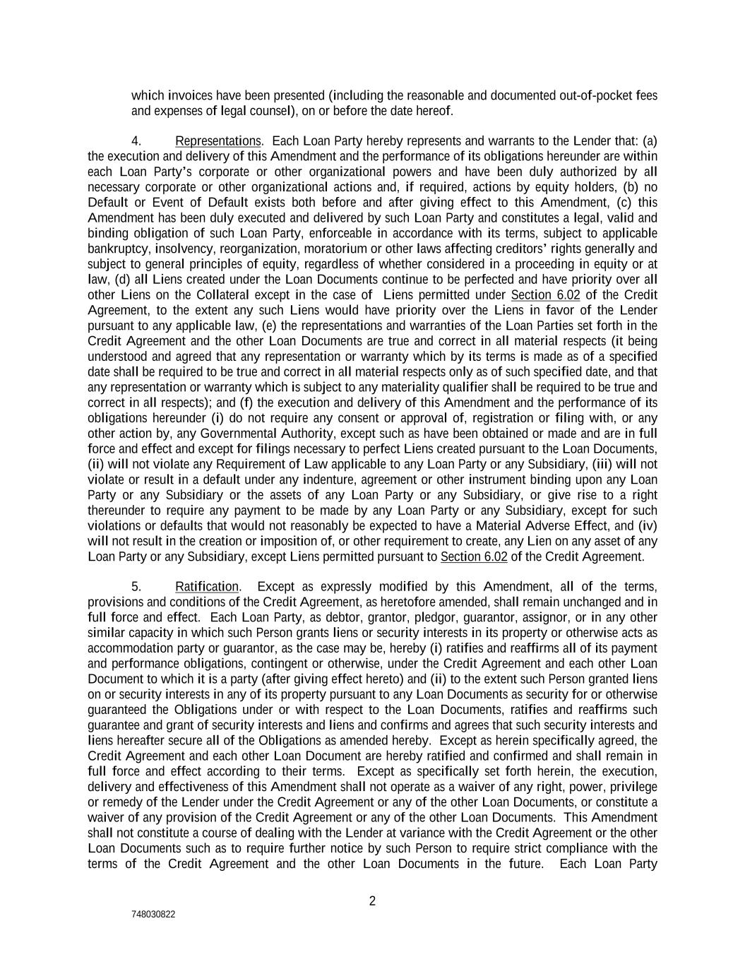 2 748030822 which invoices have been presented (including the reasonable and documented out-of-pocket fees and expenses of legal counsel), on or before the date hereof. 4. Representations. Each Loan Party hereby represents and warrants to the Lender that: (a) the execution and delivery of this Amendment and the performance of its obligations hereunder are within each Loan Party’s corporate or other organizational powers and have been duly authorized by all necessary corporate or other organizational actions and, if required, actions by equity holders, (b) no Default or Event of Default exists both before and after giving effect to this Amendment, (c) this Amendment has been duly executed and delivered by such Loan Party and constitutes a legal, valid and binding obligation of such Loan Party, enforceable in accordance with its terms, subject to applicable bankruptcy, insolvency, reorganization, moratorium or other laws affecting creditors’ rights generally and subject to general principles of equity, regardless of whether considered in a proceeding in equity or at law, (d) all Liens created under the Loan Documents continue to be perfected and have priority over all other Liens on the Collateral except in the case of Liens permitted under Section 6.02 of the Credit Agreement, to the extent any such Liens would have priority over the Liens in favor of the Lender pursuant to any applicable law, (e) the representations and warranties of the Loan Parties set forth in the Credit Agreement and the other Loan Documents are true and correct in all material respects (it being understood and agreed that any representation or warranty which by its terms is made as of a specified date shall be required to be true and correct in all material respects only as of such specified date, and that any representation or warranty which is subject to any materiality qualifier shall be required to be true and correct in all respects); and (f) the execution and delivery of this Amendment and the performance of its obligations hereunder (i) do not require any consent or approval of, registration or filing with, or any other action by, any Governmental Authority, except such as have been obtained or made and are in full force and effect and except for filings necessary to perfect Liens created pursuant to the Loan Documents, (ii) will not violate any Requirement of Law applicable to any Loan Party or any Subsidiary, (iii) will not violate or result in a default under any indenture, agreement or other instrument binding upon any Loan Party or any Subsidiary or the assets of any Loan Party or any Subsidiary, or give rise to a right thereunder to require any payment to be made by any Loan Party or any Subsidiary, except for such violations or defaults that would not reasonably be expected to have a Material Adverse Effect, and (iv) will not result in the creation or imposition of, or other requirement to create, any Lien on any asset of any Loan Party or any Subsidiary, except Liens permitted pursuant to Section 6.02 of the Credit Agreement. 5. Ratification. Except as expressly modified by this Amendment, all of the terms, provisions and conditions of the Credit Agreement, as heretofore amended, shall remain unchanged and in full force and effect. Each Loan Party, as debtor, grantor, pledgor, guarantor, assignor, or in any other similar capacity in which such Person grants liens or security interests in its property or otherwise acts as accommodation party or guarantor, as the case may be, hereby (i) ratifies and reaffirms all of its payment and performance obligations, contingent or otherwise, under the Credit Agreement and each other Loan Document to which it is a party (after giving effect hereto) and (ii) to the extent such Person granted liens on or security interests in any of its property pursuant to any Loan Documents as security for or otherwise guaranteed the Obligations under or with respect to the Loan Documents, ratifies and reaffirms such guarantee and grant of security interests and liens and confirms and agrees that such security interests and liens hereafter secure all of the Obligations as amended hereby. Except as herein specifically agreed, the Credit Agreement and each other Loan Document are hereby ratified and confirmed and shall remain in full force and effect according to their terms. Except as specifically set forth herein, the execution, delivery and effectiveness of this Amendment shall not operate as a waiver of any right, power, privilege or remedy of the Lender under the Credit Agreement or any of the other Loan Documents, or constitute a waiver of any provision of the Credit Agreement or any of the other Loan Documents. This Amendment shall not constitute a course of dealing with the Lender at variance with the Credit Agreement or the other Loan Documents such as to require further notice by such Person to require strict compliance with the terms of the Credit Agreement and the other Loan Documents in the future. Each Loan Party
