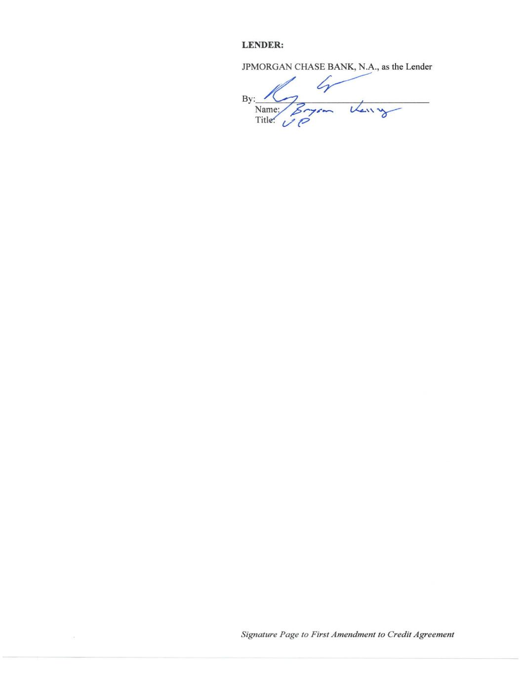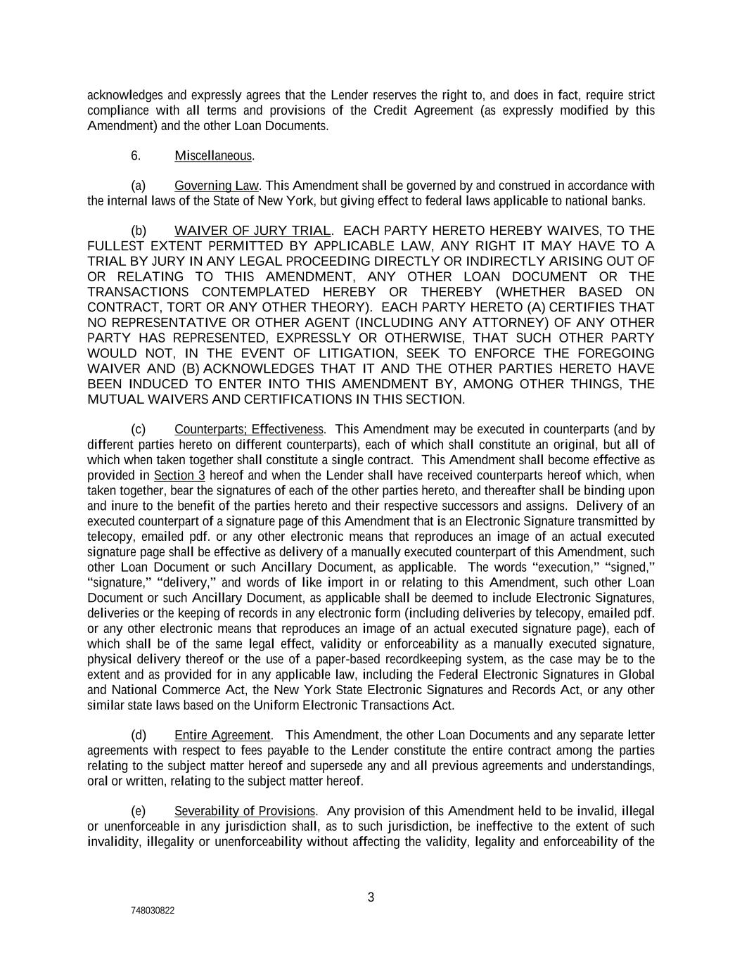 3 748030822 acknowledges and expressly agrees that the Lender reserves the right to, and does in fact, require strict compliance with all terms and provisions of the Credit Agreement (as expressly modified by this Amendment) and the other Loan Documents. 6. Miscellaneous. (a) Governing Law. This Amendment shall be governed by and construed in accordance with the internal laws of the State of New York, but giving effect to federal laws applicable to national banks. (b) WAIVER OF JURY TRIAL. EACH PARTY HERETO HEREBY WAIVES, TO THE FULLEST EXTENT PERMITTED BY APPLICABLE LAW, ANY RIGHT IT MAY HAVE TO A TRIAL BY JURY IN ANY LEGAL PROCEEDING DIRECTLY OR INDIRECTLY ARISING OUT OF OR RELATING TO THIS AMENDMENT, ANY OTHER LOAN DOCUMENT OR THE TRANSACTIONS CONTEMPLATED HEREBY OR THEREBY (WHETHER BASED ON CONTRACT, TORT OR ANY OTHER THEORY). EACH PARTY HERETO (A) CERTIFIES THAT NO REPRESENTATIVE OR OTHER AGENT (INCLUDING ANY ATTORNEY) OF ANY OTHER PARTY HAS REPRESENTED, EXPRESSLY OR OTHERWISE, THAT SUCH OTHER PARTY WOULD NOT, IN THE EVENT OF LITIGATION, SEEK TO ENFORCE THE FOREGOING WAIVER AND (B) ACKNOWLEDGES THAT IT AND THE OTHER PARTIES HERETO HAVE BEEN INDUCED TO ENTER INTO THIS AMENDMENT BY, AMONG OTHER THINGS, THE MUTUAL WAIVERS AND CERTIFICATIONS IN THIS SECTION. (c) Counterparts; Effectiveness. This Amendment may be executed in counterparts (and by different parties hereto on different counterparts), each of which shall constitute an original, but all of which when taken together shall constitute a single contract. This Amendment shall become effective as provided in Section 3 hereof and when the Lender shall have received counterparts hereof which, when taken together, bear the signatures of each of the other parties hereto, and thereafter shall be binding upon and inure to the benefit of the parties hereto and their respective successors and assigns. Delivery of an executed counterpart of a signature page of this Amendment that is an Electronic Signature transmitted by telecopy, emailed pdf. or any other electronic means that reproduces an image of an actual executed signature page shall be effective as delivery of a manually executed counterpart of this Amendment, such other Loan Document or such Ancillary Document, as applicable. The words “execution,” “signed,” “signature,” “delivery,” and words of like import in or relating to this Amendment, such other Loan Document or such Ancillary Document, as applicable shall be deemed to include Electronic Signatures, deliveries or the keeping of records in any electronic form (including deliveries by telecopy, emailed pdf. or any other electronic means that reproduces an image of an actual executed signature page), each of which shall be of the same legal effect, validity or enforceability as a manually executed signature, physical delivery thereof or the use of a paper-based recordkeeping system, as the case may be to the extent and as provided for in any applicable law, including the Federal Electronic Signatures in Global and National Commerce Act, the New York State Electronic Signatures and Records Act, or any other similar state laws based on the Uniform Electronic Transactions Act. (d) Entire Agreement. This Amendment, the other Loan Documents and any separate letter agreements with respect to fees payable to the Lender constitute the entire contract among the parties relating to the subject matter hereof and supersede any and all previous agreements and understandings, oral or written, relating to the subject matter hereof. (e) Severability of Provisions. Any provision of this Amendment held to be invalid, illegal or unenforceable in any jurisdiction shall, as to such jurisdiction, be ineffective to the extent of such invalidity, illegality or unenforceability without affecting the validity, legality and enforceability of the