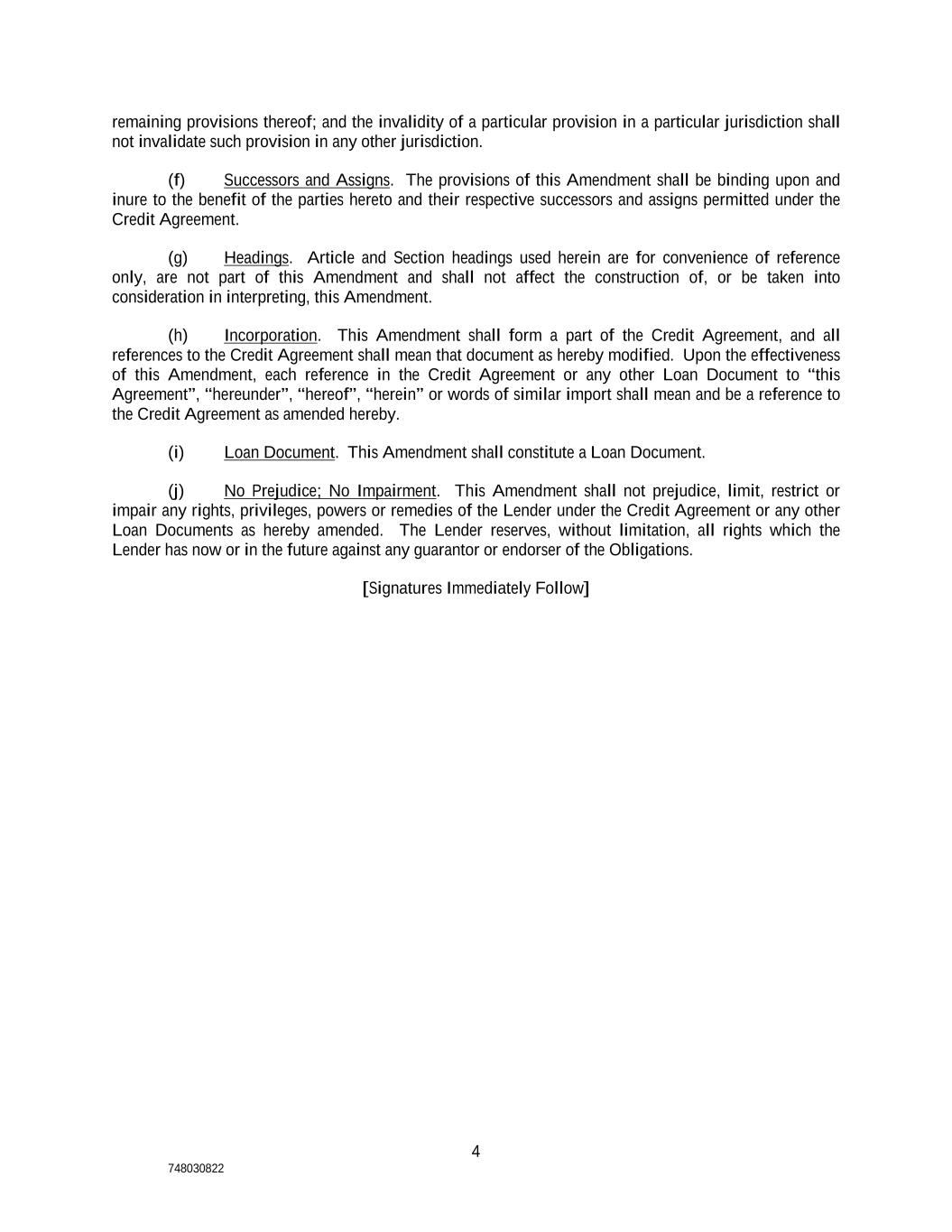 4 748030822 remaining provisions thereof; and the invalidity of a particular provision in a particular jurisdiction shall not invalidate such provision in any other jurisdiction. (f) Successors and Assigns. The provisions of this Amendment shall be binding upon and inure to the benefit of the parties hereto and their respective successors and assigns permitted under the Credit Agreement. (g) Headings. Article and Section headings used herein are for convenience of reference only, are not part of this Amendment and shall not affect the construction of, or be taken into consideration in interpreting, this Amendment. (h) Incorporation. This Amendment shall form a part of the Credit Agreement, and all references to the Credit Agreement shall mean that document as hereby modified. Upon the effectiveness of this Amendment, each reference in the Credit Agreement or any other Loan Document to “this Agreement”, “hereunder”, “hereof”, “herein” or words of similar import shall mean and be a reference to the Credit Agreement as amended hereby. (i) Loan Document. This Amendment shall constitute a Loan Document. (j) No Prejudice; No Impairment. This Amendment shall not prejudice, limit, restrict or impair any rights, privileges, powers or remedies of the Lender under the Credit Agreement or any other Loan Documents as hereby amended. The Lender reserves, without limitation, all rights which the Lender has now or in the future against any guarantor or endorser of the Obligations. [Signatures Immediately Follow]