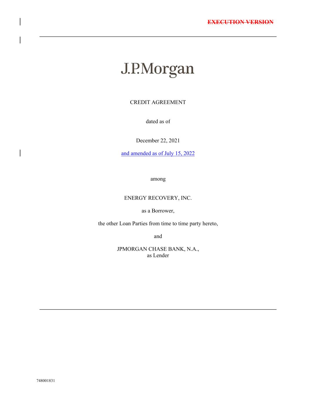EXECUTION VERSION 748001831 CREDIT AGREEMENT dated as of December 22, 2021 and amended as of July 15, 2022 among ENERGY RECOVERY, INC. as a Borrower, the other Loan Parties from time to time party hereto, and JPMORGAN CHASE BANK, N.A., as Lender