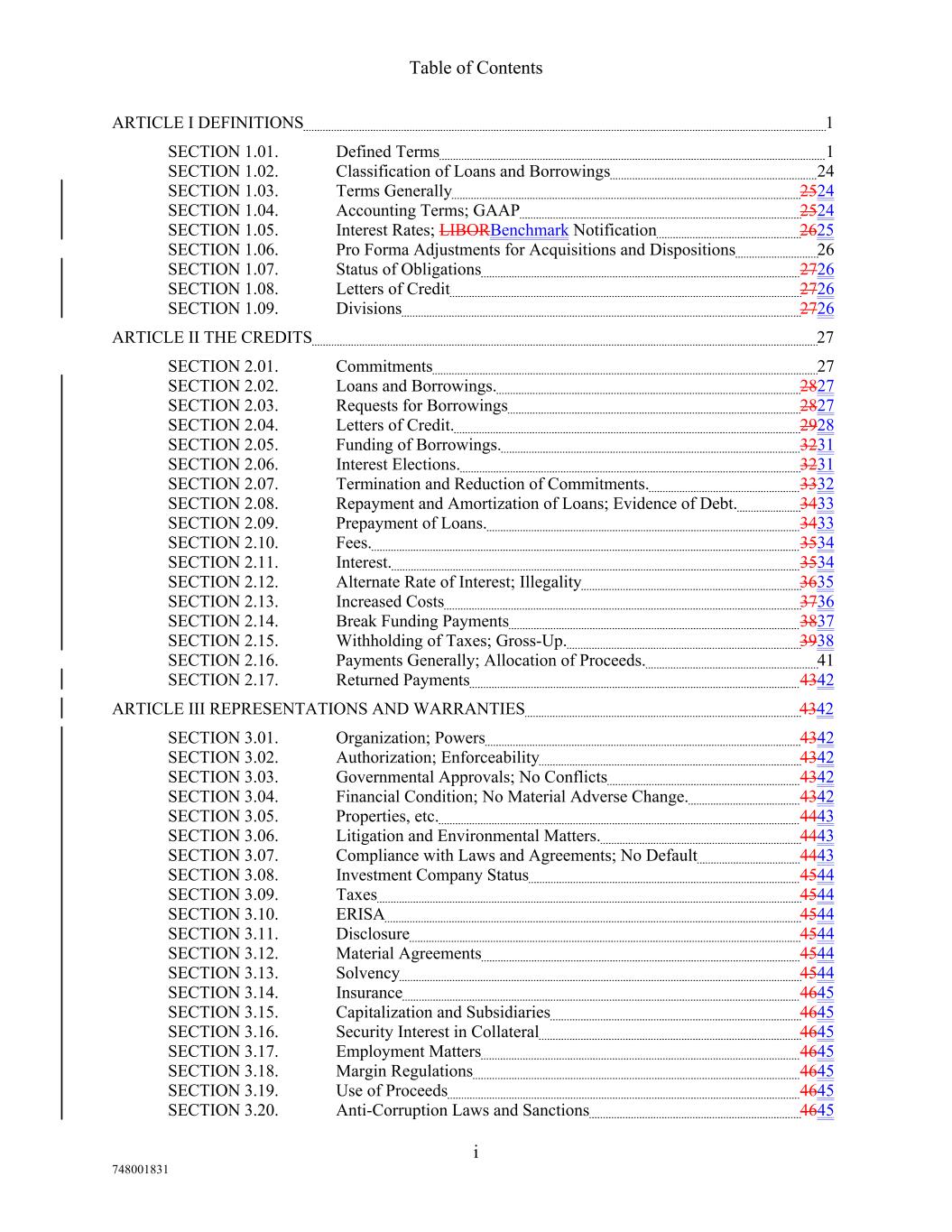 Table of Contents ARTICLE I DEFINITIONS 1 SECTION 1.01. Defined Terms 1 SECTION 1.02. Classification of Loans and Borrowings 24 SECTION 1.03. Terms Generally 2524 SECTION 1.04. Accounting Terms; GAAP 2524 SECTION 1.05. Interest Rates; LIBORBenchmark Notification 2625 SECTION 1.06. Pro Forma Adjustments for Acquisitions and Dispositions 26 SECTION 1.07. Status of Obligations 2726 SECTION 1.08. Letters of Credit 2726 SECTION 1.09. Divisions 2726 ARTICLE II THE CREDITS 27 SECTION 2.01. Commitments 27 SECTION 2.02. Loans and Borrowings. 2827 SECTION 2.03. Requests for Borrowings 2827 SECTION 2.04. Letters of Credit. 2928 SECTION 2.05. Funding of Borrowings. 3231 SECTION 2.06. Interest Elections. 3231 SECTION 2.07. Termination and Reduction of Commitments. 3332 SECTION 2.08. Repayment and Amortization of Loans; Evidence of Debt. 3433 SECTION 2.09. Prepayment of Loans. 3433 SECTION 2.10. Fees. 3534 SECTION 2.11. Interest. 3534 SECTION 2.12. Alternate Rate of Interest; Illegality 3635 SECTION 2.13. Increased Costs 3736 SECTION 2.14. Break Funding Payments 3837 SECTION 2.15. Withholding of Taxes; Gross-Up. 3938 SECTION 2.16. Payments Generally; Allocation of Proceeds. 41 SECTION 2.17. Returned Payments 4342 ARTICLE III REPRESENTATIONS AND WARRANTIES 4342 SECTION 3.01. Organization; Powers 4342 SECTION 3.02. Authorization; Enforceability 4342 SECTION 3.03. Governmental Approvals; No Conflicts 4342 SECTION 3.04. Financial Condition; No Material Adverse Change. 4342 SECTION 3.05. Properties, etc. 4443 SECTION 3.06. Litigation and Environmental Matters. 4443 SECTION 3.07. Compliance with Laws and Agreements; No Default 4443 SECTION 3.08. Investment Company Status 4544 SECTION 3.09. Taxes 4544 SECTION 3.10. ERISA 4544 SECTION 3.11. Disclosure 4544 SECTION 3.12. Material Agreements 4544 SECTION 3.13. Solvency 4544 SECTION 3.14. Insurance 4645 SECTION 3.15. Capitalization and Subsidiaries 4645 SECTION 3.16. Security Interest in Collateral 4645 SECTION 3.17. Employment Matters 4645 SECTION 3.18. Margin Regulations 4645 SECTION 3.19. Use of Proceeds 4645 SECTION 3.20. Anti-Corruption Laws and Sanctions 4645 i 748001831
