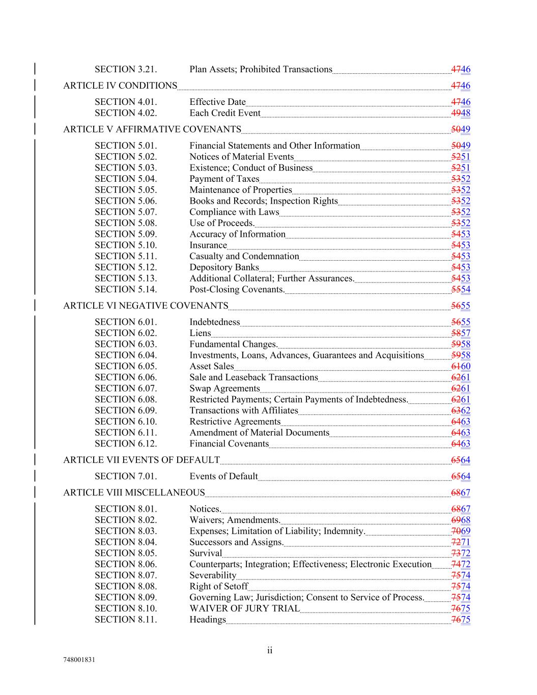 SECTION 3.21. Plan Assets; Prohibited Transactions 4746 ARTICLE IV CONDITIONS 4746 SECTION 4.01. Effective Date 4746 SECTION 4.02. Each Credit Event 4948 ARTICLE V AFFIRMATIVE COVENANTS 5049 SECTION 5.01. Financial Statements and Other Information 5049 SECTION 5.02. Notices of Material Events 5251 SECTION 5.03. Existence; Conduct of Business 5251 SECTION 5.04. Payment of Taxes 5352 SECTION 5.05. Maintenance of Properties 5352 SECTION 5.06. Books and Records; Inspection Rights 5352 SECTION 5.07. Compliance with Laws 5352 SECTION 5.08. Use of Proceeds. 5352 SECTION 5.09. Accuracy of Information 5453 SECTION 5.10. Insurance 5453 SECTION 5.11. Casualty and Condemnation 5453 SECTION 5.12. Depository Banks 5453 SECTION 5.13. Additional Collateral; Further Assurances. 5453 SECTION 5.14. Post-Closing Covenants. 5554 ARTICLE VI NEGATIVE COVENANTS 5655 SECTION 6.01. Indebtedness 5655 SECTION 6.02. Liens 5857 SECTION 6.03. Fundamental Changes. 5958 SECTION 6.04. Investments, Loans, Advances, Guarantees and Acquisitions 5958 SECTION 6.05. Asset Sales 6160 SECTION 6.06. Sale and Leaseback Transactions 6261 SECTION 6.07. Swap Agreements 6261 SECTION 6.08. Restricted Payments; Certain Payments of Indebtedness. 6261 SECTION 6.09. Transactions with Affiliates 6362 SECTION 6.10. Restrictive Agreements 6463 SECTION 6.11. Amendment of Material Documents 6463 SECTION 6.12. Financial Covenants 6463 ARTICLE VII EVENTS OF DEFAULT 6564 SECTION 7.01. Events of Default 6564 ARTICLE VIII MISCELLANEOUS 6867 SECTION 8.01. Notices. 6867 SECTION 8.02. Waivers; Amendments. 6968 SECTION 8.03. Expenses; Limitation of Liability; Indemnity. 7069 SECTION 8.04. Successors and Assigns. 7271 SECTION 8.05. Survival 7372 SECTION 8.06. Counterparts; Integration; Effectiveness; Electronic Execution 7472 SECTION 8.07. Severability 7574 SECTION 8.08. Right of Setoff 7574 SECTION 8.09. Governing Law; Jurisdiction; Consent to Service of Process. 7574 SECTION 8.10. WAIVER OF JURY TRIAL 7675 SECTION 8.11. Headings 7675 ii 748001831