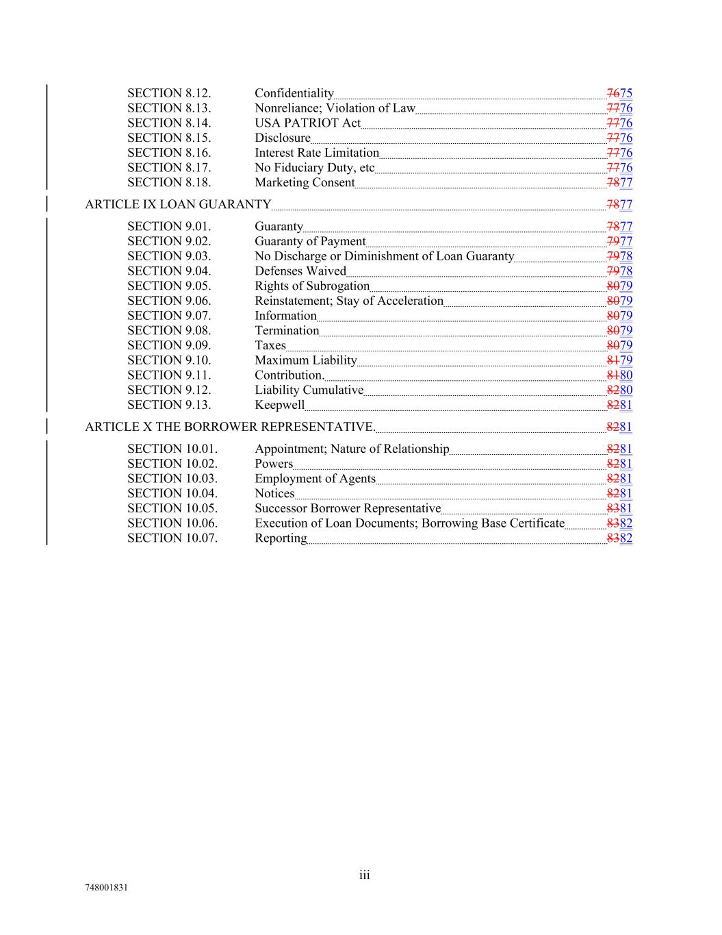 SECTION 8.12. Confidentiality 7675 SECTION 8.13. Nonreliance; Violation of Law 7776 SECTION 8.14. USA PATRIOT Act 7776 SECTION 8.15. Disclosure 7776 SECTION 8.16. Interest Rate Limitation 7776 SECTION 8.17. No Fiduciary Duty, etc 7776 SECTION 8.18. Marketing Consent 7877 ARTICLE IX LOAN GUARANTY 7877 SECTION 9.01. Guaranty 7877 SECTION 9.02. Guaranty of Payment 7977 SECTION 9.03. No Discharge or Diminishment of Loan Guaranty 7978 SECTION 9.04. Defenses Waived 7978 SECTION 9.05. Rights of Subrogation 8079 SECTION 9.06. Reinstatement; Stay of Acceleration 8079 SECTION 9.07. Information 8079 SECTION 9.08. Termination 8079 SECTION 9.09. Taxes 8079 SECTION 9.10. Maximum Liability 8179 SECTION 9.11. Contribution. 8180 SECTION 9.12. Liability Cumulative 8280 SECTION 9.13. Keepwell 8281 ARTICLE X THE BORROWER REPRESENTATIVE. 8281 SECTION 10.01. Appointment; Nature of Relationship 8281 SECTION 10.02. Powers 8281 SECTION 10.03. Employment of Agents 8281 SECTION 10.04. Notices 8281 SECTION 10.05. Successor Borrower Representative 8381 SECTION 10.06. Execution of Loan Documents; Borrowing Base Certificate 8382 SECTION 10.07. Reporting 8382 iii 748001831