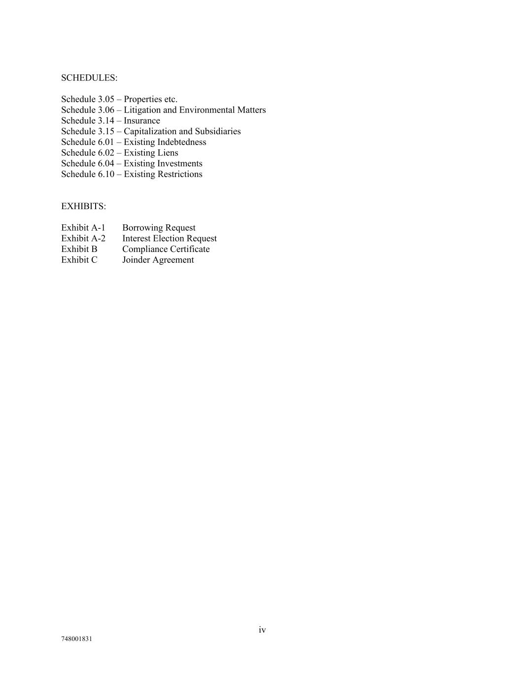 SCHEDULES: Schedule 3.05 – Properties etc. Schedule 3.06 – Litigation and Environmental Matters Schedule 3.14 – Insurance Schedule 3.15 – Capitalization and Subsidiaries Schedule 6.01 – Existing Indebtedness Schedule 6.02 – Existing Liens Schedule 6.04 – Existing Investments Schedule 6.10 – Existing Restrictions EXHIBITS: Exhibit A-1 Borrowing Request Exhibit A-2 Interest Election Request Exhibit B Compliance Certificate Exhibit C Joinder Agreement iv 748001831