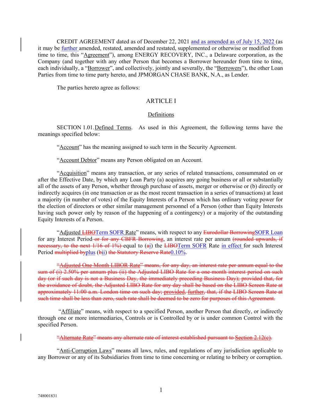 CREDIT AGREEMENT dated as of December 22, 2021 and as amended as of July 15, 2022 (as it may be further amended, restated, amended and restated, supplemented or otherwise or modified from time to time, this “Agreement”), among ENERGY RECOVERY, INC., a Delaware corporation, as the Company (and together with any other Person that becomes a Borrower hereunder from time to time, each individually, a “Borrower”, and collectively, jointly and severally, the “Borrowers”), the other Loan Parties from time to time party hereto, and JPMORGAN CHASE BANK, N.A., as Lender. The parties hereto agree as follows: ARTICLE I Definitions SECTION 1.01.Defined Terms. As used in this Agreement, the following terms have the meanings specified below: “Account” has the meaning assigned to such term in the Security Agreement. “Account Debtor” means any Person obligated on an Account. “Acquisition” means any transaction, or any series of related transactions, consummated on or after the Effective Date, by which any Loan Party (a) acquires any going business or all or substantially all of the assets of any Person, whether through purchase of assets, merger or otherwise or (b) directly or indirectly acquires (in one transaction or as the most recent transaction in a series of transactions) at least a majority (in number of votes) of the Equity Interests of a Person which has ordinary voting power for the election of directors or other similar management personnel of a Person (other than Equity Interests having such power only by reason of the happening of a contingency) or a majority of the outstanding Equity Interests of a Person. “Adjusted LIBOTerm SOFR Rate” means, with respect to any Eurodollar BorrowingSOFR Loan for any Interest Period or for any CBFR Borrowing, an interest rate per annum (rounded upwards, if necessary, to the next 1/16 of 1%) equal to (ai) the LIBOTerm SOFR Rate in effect for such Interest Period multiplied byplus (bii) the Statutory Reserve Rate0.10%. “Adjusted One Month LIBOR Rate” means, for any day, an interest rate per annum equal to the sum of (i) 2.50% per annum plus (ii) the Adjusted LIBO Rate for a one-month interest period on such day (or if such day is not a Business Day, the immediately preceding Business Day); provided that, for the avoidance of doubt, the Adjusted LIBO Rate for any day shall be based on the LIBO Screen Rate at approximately 11:00 a.m. London time on such day; provided, further, that, if the LIBO Screen Rate at such time shall be less than zero, such rate shall be deemed to be zero for purposes of this Agreement. “Affiliate” means, with respect to a specified Person, another Person that directly, or indirectly through one or more intermediaries, Controls or is Controlled by or is under common Control with the specified Person. “Alternate Rate” means any alternate rate of interest established pursuant to Section 2.12(c). “Anti-Corruption Laws” means all laws, rules, and regulations of any jurisdiction applicable to any Borrower or any of its Subsidiaries from time to time concerning or relating to bribery or corruption. 1 748001831
