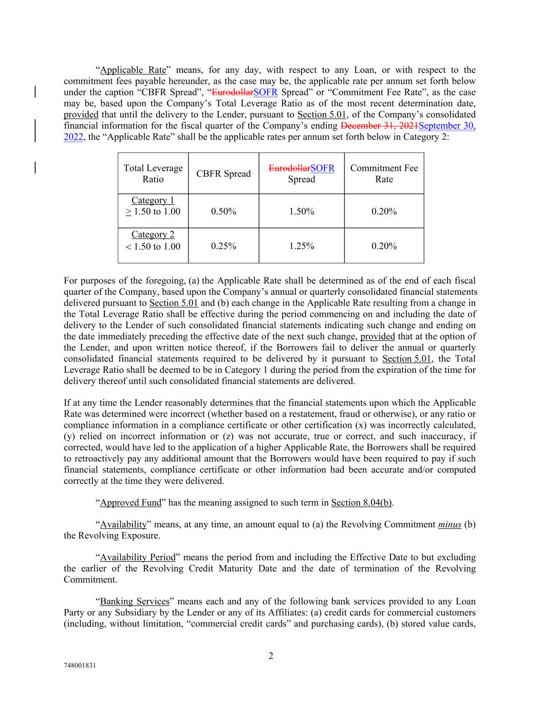 2 748001831 0.50% CBFR Spread 1.50% “Applicable Rate” means, for any day, with respect to any Loan, or with respect to the commitment fees payable hereunder, as the case may be, the applicable rate per annum set forth below under the caption “CBFR Spread”, “EurodollarSOFR Spread” or “Commitment Fee Rate”, as the case may be, based upon the Company’s Total Leverage Ratio as of the most recent determination date, provided that until the delivery to the Lender, pursuant to Section 5.01, of the Company’s consolidated financial information for the fiscal quarter of the Company’s ending December 31, 2021September 30, 2022, the “Applicable Rate” shall be the applicable rates per annum set forth below in Category 2: 0.20% EurodollarSOFR Spread Category 2  1.50 to 1.00 Commitment Fee Rate 0.25% 1.25% 0.20% Total Leverage Ratio For purposes of the foregoing, (a) the Applicable Rate shall be determined as of the end of each fiscal quarter of the Company, based upon the Company’s annual or quarterly consolidated financial statements delivered pursuant to Section 5.01 and (b) each change in the Applicable Rate resulting from a change in the Total Leverage Ratio shall be effective during the period commencing on and including the date of delivery to the Lender of such consolidated financial statements indicating such change and ending on the date immediately preceding the effective date of the next such change, provided that at the option of the Lender, and upon written notice thereof, if the Borrowers fail to deliver the annual or quarterly consolidated financial statements required to be delivered by it pursuant to Section 5.01, the Total Leverage Ratio shall be deemed to be in Category 1 during the period from the expiration of the time for delivery thereof until such consolidated financial statements are delivered. If at any time the Lender reasonably determines that the financial statements upon which the Applicable Rate was determined were incorrect (whether based on a restatement, fraud or otherwise), or any ratio or compliance information in a compliance certificate or other certification (x) was incorrectly calculated, (y) relied on incorrect information or (z) was not accurate, true or correct, and such inaccuracy, if corrected, would have led to the application of a higher Applicable Rate, the Borrowers shall be required to retroactively pay any additional amount that the Borrowers would have been required to pay if such financial statements, compliance certificate or other information had been accurate and/or computed correctly at the time they were delivered. “Approved Fund” has the meaning assigned to such term in Section 8.04(b). “Availability” means, at any time, an amount equal to (a) the Revolving Commitment minus (b) the Revolving Exposure. “Availability Period” means the period from and including the Effective Date to but excluding the earlier of the Revolving Credit Maturity Date and the date of termination of the Revolving Commitment. “Banking Services” means each and any of the following bank services provided to any Loan Party or any Subsidiary by the Lender or any of its Affiliates: (a) credit cards for commercial customers (including, without limitation, “commercial credit cards” and purchasing cards), (b) stored value cards, Category 1 > 1.50 to 1.00