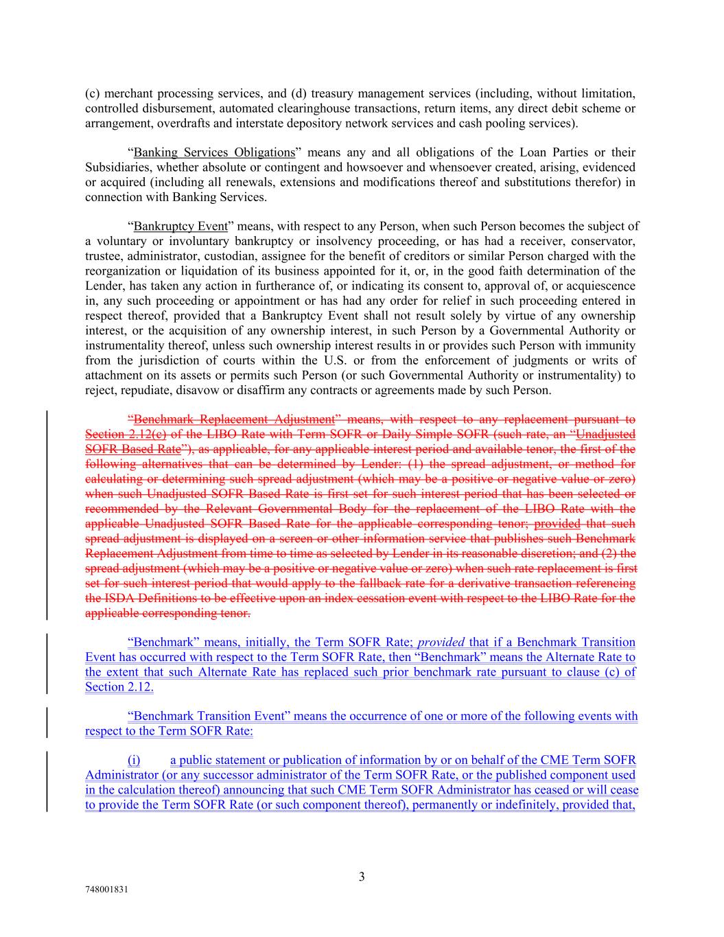 (c) merchant processing services, and (d) treasury management services (including, without limitation, controlled disbursement, automated clearinghouse transactions, return items, any direct debit scheme or arrangement, overdrafts and interstate depository network services and cash pooling services). “Banking Services Obligations” means any and all obligations of the Loan Parties or their Subsidiaries, whether absolute or contingent and howsoever and whensoever created, arising, evidenced or acquired (including all renewals, extensions and modifications thereof and substitutions therefor) in connection with Banking Services. “Bankruptcy Event” means, with respect to any Person, when such Person becomes the subject of a voluntary or involuntary bankruptcy or insolvency proceeding, or has had a receiver, conservator, trustee, administrator, custodian, assignee for the benefit of creditors or similar Person charged with the reorganization or liquidation of its business appointed for it, or, in the good faith determination of the Lender, has taken any action in furtherance of, or indicating its consent to, approval of, or acquiescence in, any such proceeding or appointment or has had any order for relief in such proceeding entered in respect thereof, provided that a Bankruptcy Event shall not result solely by virtue of any ownership interest, or the acquisition of any ownership interest, in such Person by a Governmental Authority or instrumentality thereof, unless such ownership interest results in or provides such Person with immunity from the jurisdiction of courts within the U.S. or from the enforcement of judgments or writs of attachment on its assets or permits such Person (or such Governmental Authority or instrumentality) to reject, repudiate, disavow or disaffirm any contracts or agreements made by such Person. “Benchmark Replacement Adjustment” means, with respect to any replacement pursuant to Section 2.12(c) of the LIBO Rate with Term SOFR or Daily Simple SOFR (such rate, an “Unadjusted SOFR Based Rate”), as applicable, for any applicable interest period and available tenor, the first of the following alternatives that can be determined by Lender: (1) the spread adjustment, or method for calculating or determining such spread adjustment (which may be a positive or negative value or zero) when such Unadjusted SOFR Based Rate is first set for such interest period that has been selected or recommended by the Relevant Governmental Body for the replacement of the LIBO Rate with the applicable Unadjusted SOFR Based Rate for the applicable corresponding tenor; provided that such spread adjustment is displayed on a screen or other information service that publishes such Benchmark Replacement Adjustment from time to time as selected by Lender in its reasonable discretion; and (2) the spread adjustment (which may be a positive or negative value or zero) when such rate replacement is first set for such interest period that would apply to the fallback rate for a derivative transaction referencing the ISDA Definitions to be effective upon an index cessation event with respect to the LIBO Rate for the applicable corresponding tenor. “Benchmark” means, initially, the Term SOFR Rate; provided that if a Benchmark Transition Event has occurred with respect to the Term SOFR Rate, then “Benchmark” means the Alternate Rate to the extent that such Alternate Rate has replaced such prior benchmark rate pursuant to clause (c) of Section 2.12. “Benchmark Transition Event” means the occurrence of one or more of the following events with respect to the Term SOFR Rate: (i) a public statement or publication of information by or on behalf of the CME Term SOFR Administrator (or any successor administrator of the Term SOFR Rate, or the published component used in the calculation thereof) announcing that such CME Term SOFR Administrator has ceased or will cease to provide the Term SOFR Rate (or such component thereof), permanently or indefinitely, provided that, 3 748001831
