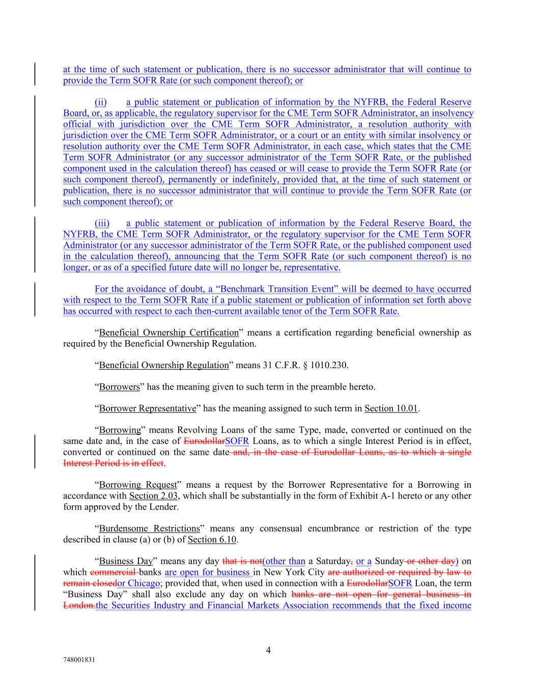 at the time of such statement or publication, there is no successor administrator that will continue to provide the Term SOFR Rate (or such component thereof); or (ii) a public statement or publication of information by the NYFRB, the Federal Reserve Board, or, as applicable, the regulatory supervisor for the CME Term SOFR Administrator, an insolvency official with jurisdiction over the CME Term SOFR Administrator, a resolution authority with jurisdiction over the CME Term SOFR Administrator, or a court or an entity with similar insolvency or resolution authority over the CME Term SOFR Administrator, in each case, which states that the CME Term SOFR Administrator (or any successor administrator of the Term SOFR Rate, or the published component used in the calculation thereof) has ceased or will cease to provide the Term SOFR Rate (or such component thereof), permanently or indefinitely, provided that, at the time of such statement or publication, there is no successor administrator that will continue to provide the Term SOFR Rate (or such component thereof); or (iii) a public statement or publication of information by the Federal Reserve Board, the NYFRB, the CME Term SOFR Administrator, or the regulatory supervisor for the CME Term SOFR Administrator (or any successor administrator of the Term SOFR Rate, or the published component used in the calculation thereof), announcing that the Term SOFR Rate (or such component thereof) is no longer, or as of a specified future date will no longer be, representative. For the avoidance of doubt, a “Benchmark Transition Event” will be deemed to have occurred with respect to the Term SOFR Rate if a public statement or publication of information set forth above has occurred with respect to each then-current available tenor of the Term SOFR Rate. “Beneficial Ownership Certification” means a certification regarding beneficial ownership as required by the Beneficial Ownership Regulation. “Beneficial Ownership Regulation” means 31 C.F.R. § 1010.230. “Borrowers” has the meaning given to such term in the preamble hereto. “Borrower Representative” has the meaning assigned to such term in Section 10.01. “Borrowing” means Revolving Loans of the same Type, made, converted or continued on the same date and, in the case of EurodollarSOFR Loans, as to which a single Interest Period is in effect, converted or continued on the same date and, in the case of Eurodollar Loans, as to which a single Interest Period is in effect. “Borrowing Request” means a request by the Borrower Representative for a Borrowing in accordance with Section 2.03, which shall be substantially in the form of Exhibit A-1 hereto or any other form approved by the Lender. “Burdensome Restrictions” means any consensual encumbrance or restriction of the type described in clause (a) or (b) of Section 6.10. “Business Day” means any day that is not(other than a Saturday, or a Sunday or other day) on which commercial banks are open for business in New York City are authorized or required by law to remain closedor Chicago; provided that, when used in connection with a EurodollarSOFR Loan, the term “Business Day” shall also exclude any day on which banks are not open for general business in London.the Securities Industry and Financial Markets Association recommends that the fixed income 4 748001831